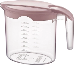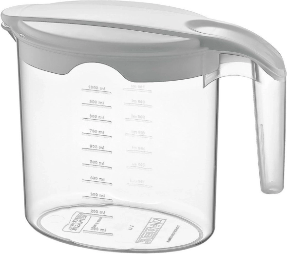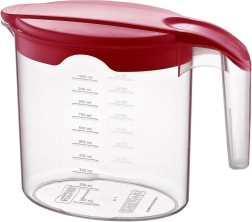 Práctica jarra de plástico de 1 litro, ideal para servir bebidas a diario en casa y en el jardín. Es ligera, resistente y cuenta con un asa cómoda para un fácil transporte. Gracias al pico vertedor, la bebida se sirve sin derrames; la escala integrada facilita una medición precisa y la tapa con cierre protege el contenido de la suciedad y el insectos. Perfecta para agua, limonada, zumos e incluso compotas.
