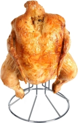 El práctico soporte para asar pollo garantiza una cocción uniforme y una piel deliciosamente crujiente. Gracias a la posición vertical, la carne no queda sumergida en la grasa, por lo que es más saludable, jugosa por dentro y crujiente por fuera. La robusta construcción de alambre cromado y la base estable facilitan un uso seguro en cualquier cocina.