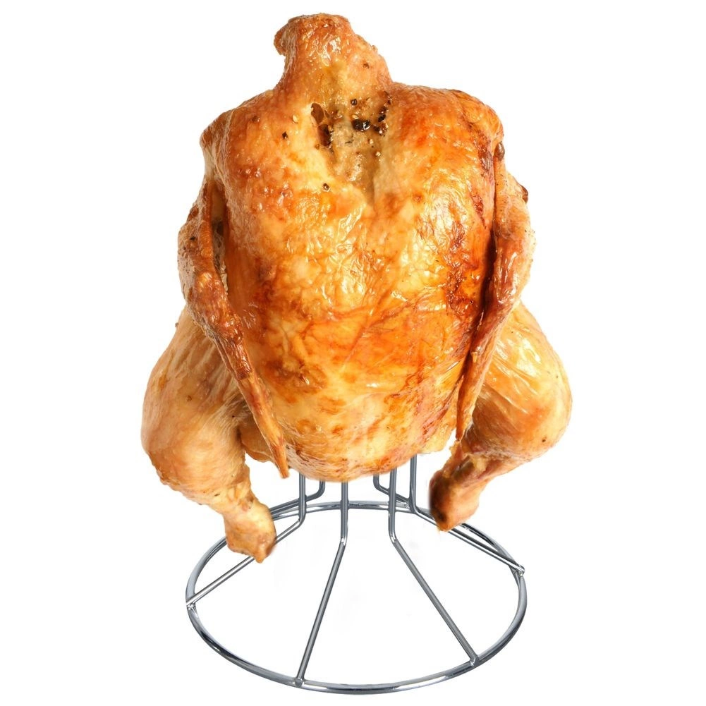 El soporte está fabricado con alambre metálico cromado de alta calidad, cuenta con una base estable y es fácil de usar y guardar. Es universal: no solo sirve para pollo, sino también para pato, pavo o ganso, lo que lo convierte en un práctico complemento para cualquier hogar.