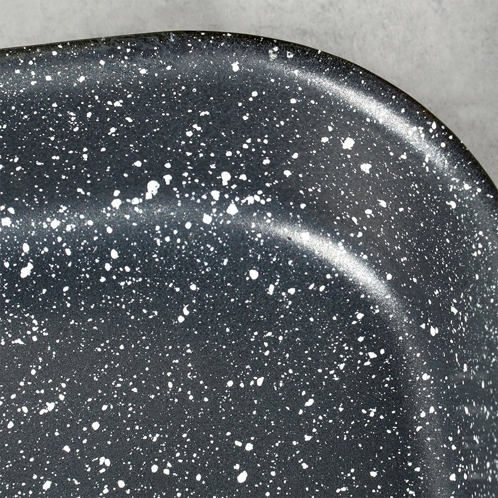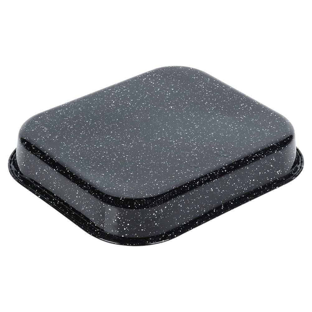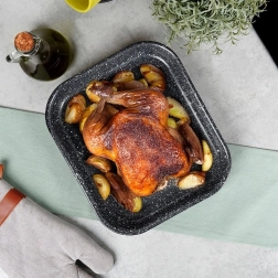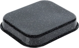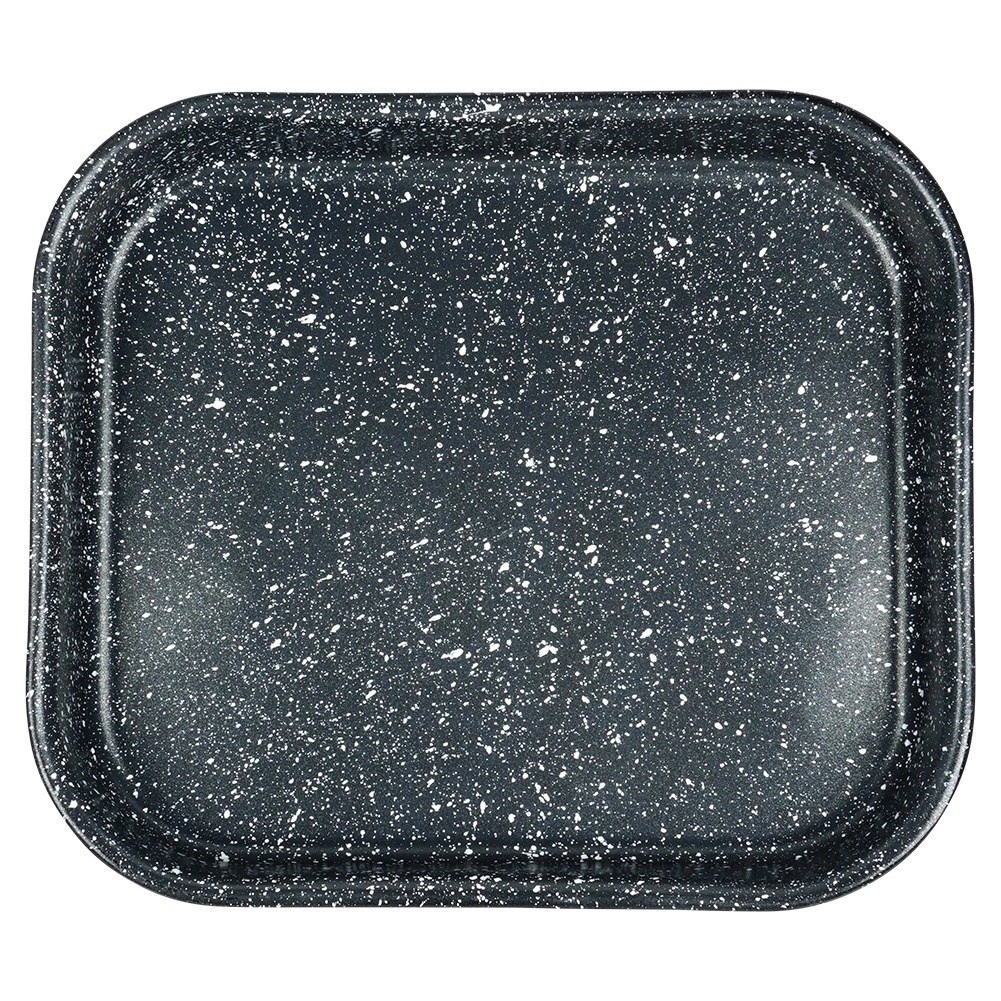 La resistente bandeja de acero con cuerpo esmaltado y superficie antiadherente de granito, altamente duradera, garantiza un horneado uniforme y un desmolde cómodo. La medida interior de 27 × 23 × 4 cm es ideal para asar pollo, verduras, bizcochos e incluso pizza casera.
