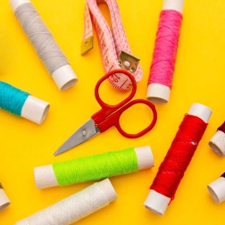 - Hilos en varios colores, agujas, tijeras pequeñas, cinta métrica, botones, dedal, enhebrador de hilo, imperdibles, acerico