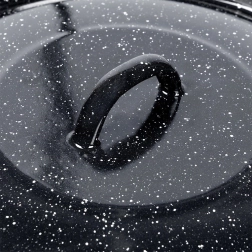 El cuerpo de acero esmaltado es resistente a los arañazos y a la corrosión, mientras que el asa robusta garantiza un levantamiento seguro incluso a temperaturas elevadas. El esmalte puede presentar de forma natural pequeñas irregularidades de fabricación (abombamientos, rociado desigual, etc.) que no afectan a la calidad ni a la función.