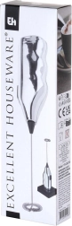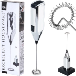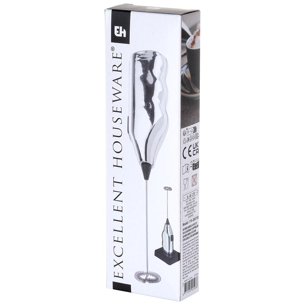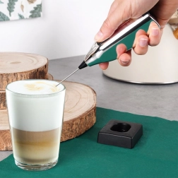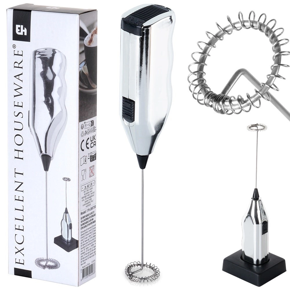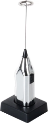 Compacto espumador de leche eléctrico de 20 cm con base para un almacenamiento cómodo. Ofrece espuma de leche rápida para cappuccino, latte y chocolate caliente, manejo sencillo con un solo botón y construcción robusta con accesorio batidor de metal. La alimentación requiere 2× pilas AA (no incluidas).
