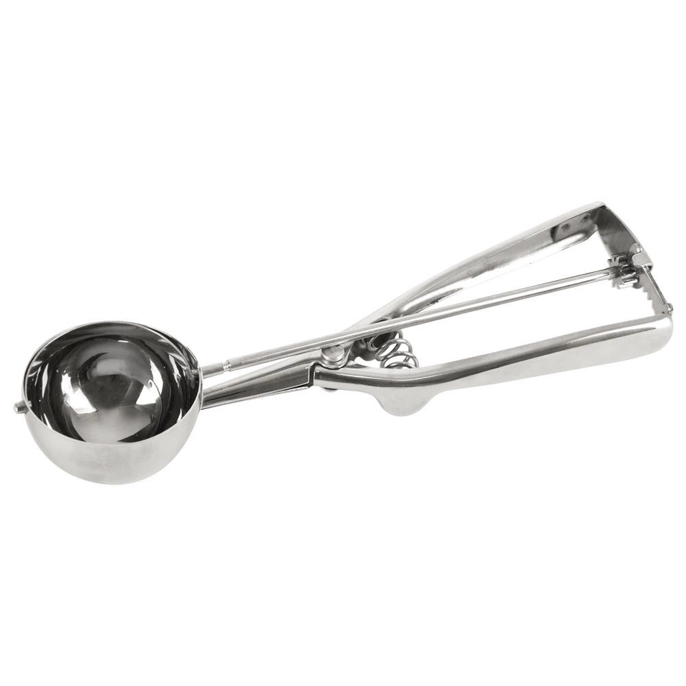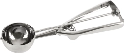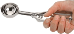 Esta robusta cuchara para helado de acero inoxidable con 22,5 cm de longitud y cazoleta de 5,5 cm de diámetro facilita el porcionado y asegura bolas siempre iguales y lisas. El expulsor automático libera suavemente la porción de la cazoleta, de modo que el servicio es rápido y limpio.
