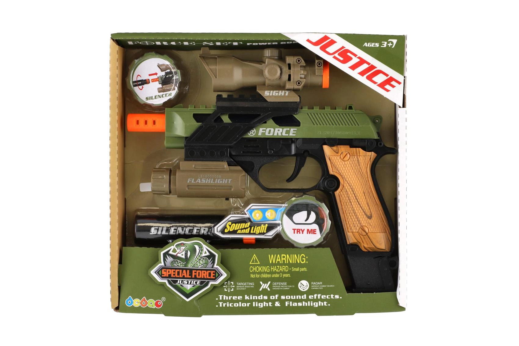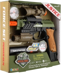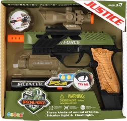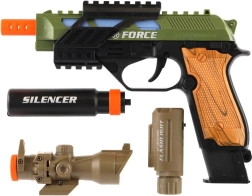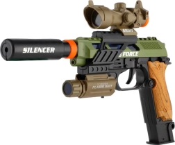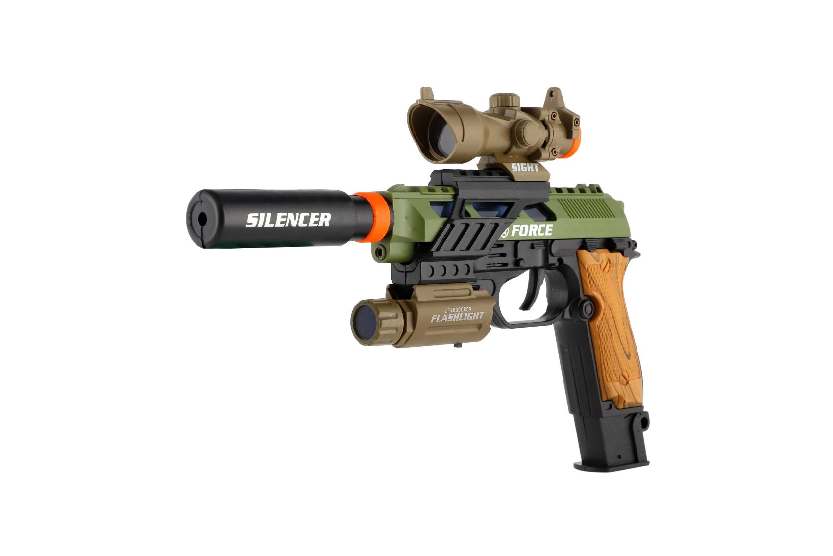 Pistola de plástico con aspecto realista para pequeños aficionados a los juegos de acción. Ofrece efectos de luz, efectos de sonido y prácticos accesorios como mira, linterna y silenciador. Funciona con pilas, que están incluidas en el paquete.