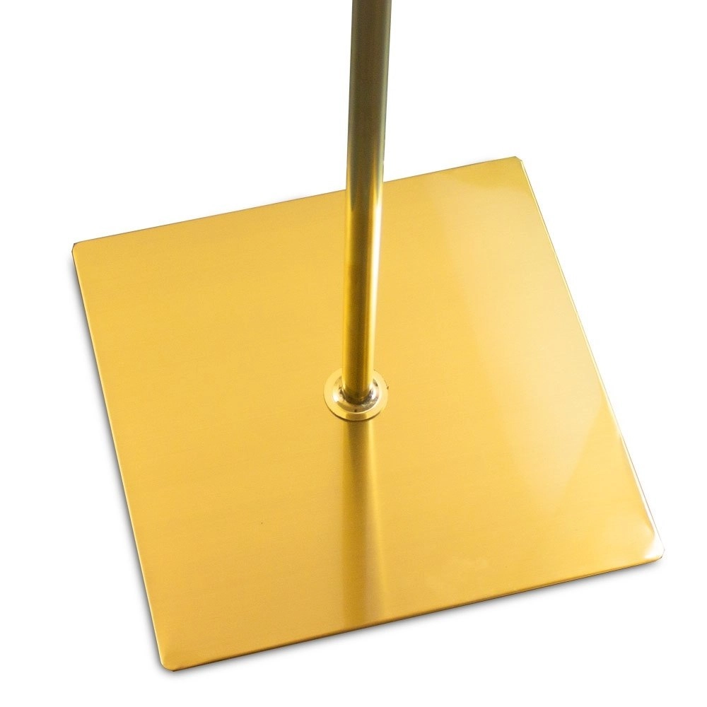 Soporte plano cuadrado con acabado dorado que aporta estabilidad y una apariencia elegante.