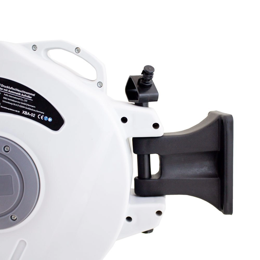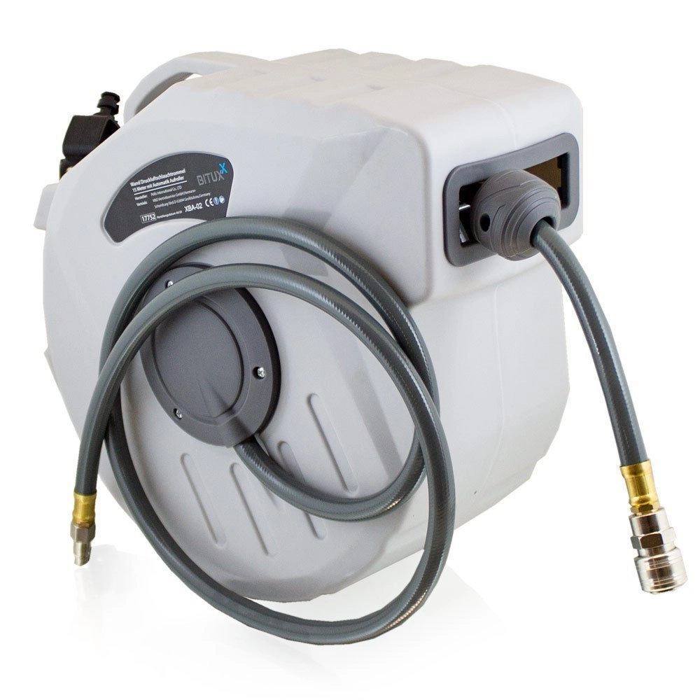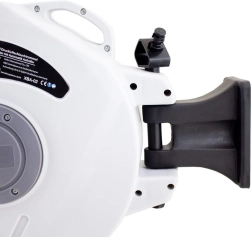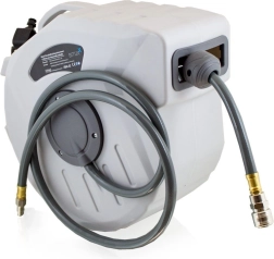 El enrollador automático de manguera neumática aporta orden, seguridad y fluidez de trabajo en el taller y el garaje. La carcasa de plástico resistente protege el mecanismo, la manguera de PVC elástico mantiene su flexibilidad incluso a bajas temperaturas y el enrollado automático mantiene la manguera siempre bien recogida.
