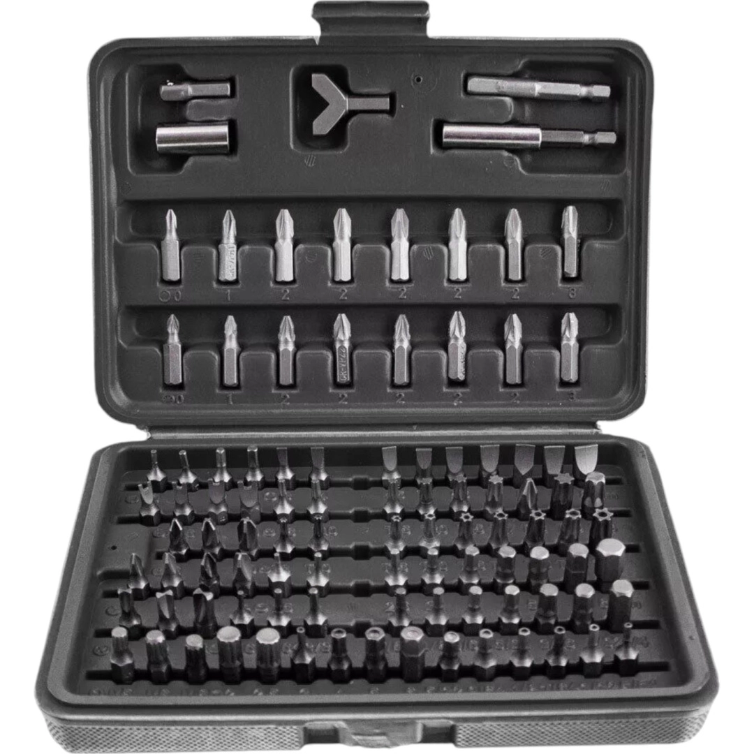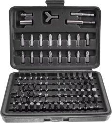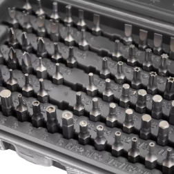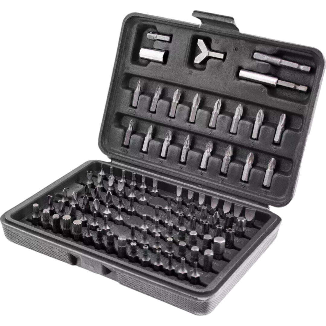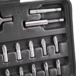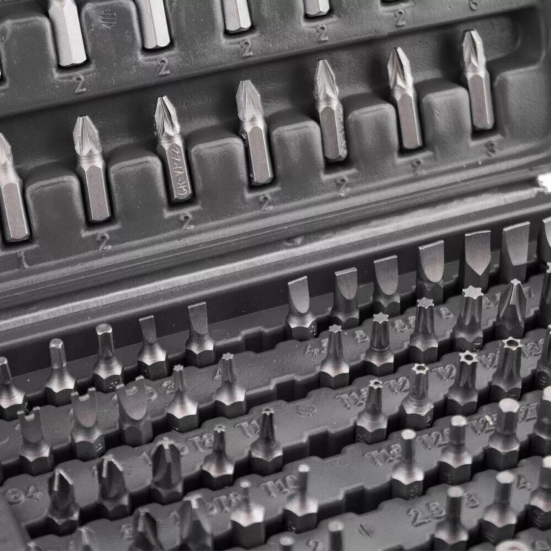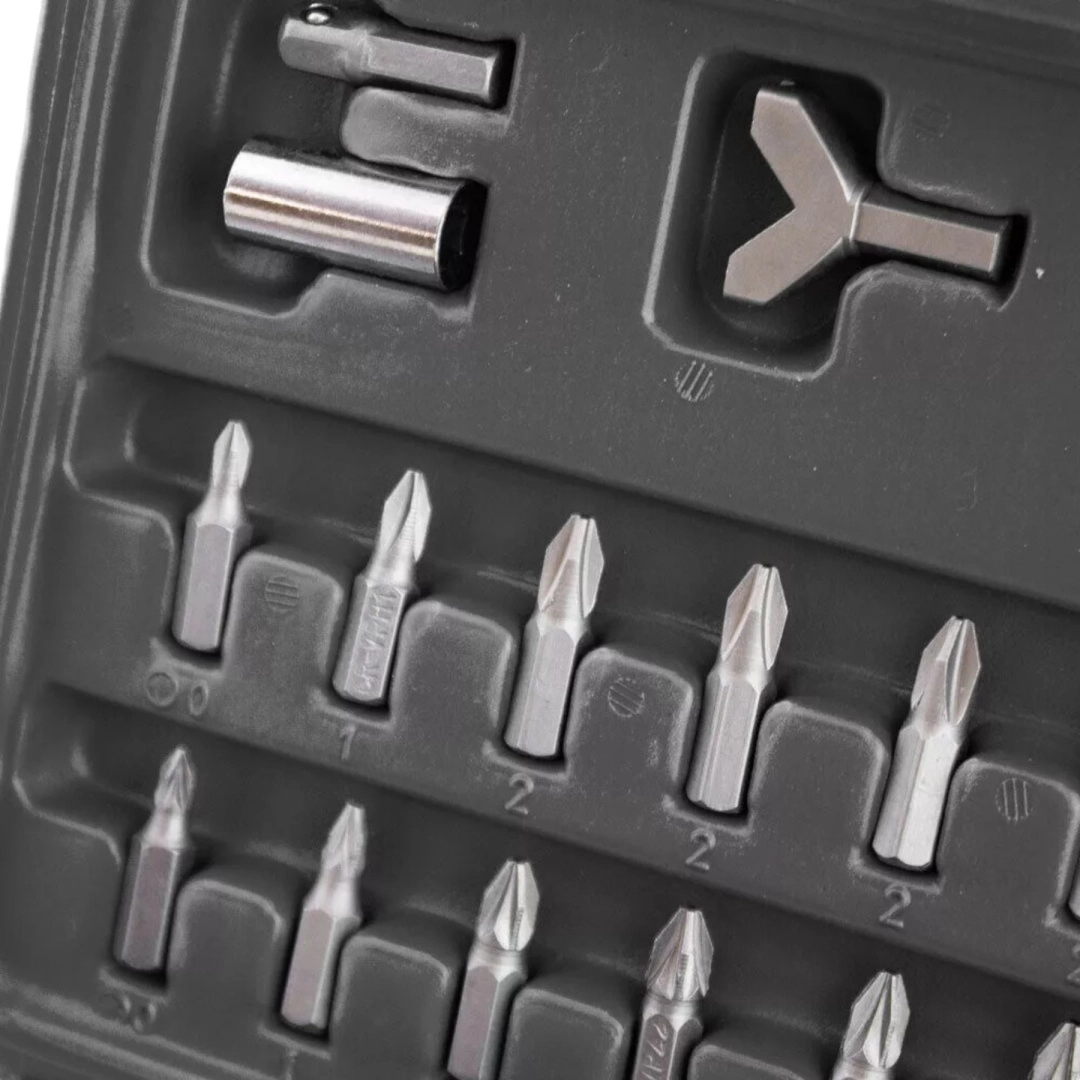 Este completo set ofrece una amplia gama de puntas: planas, de cruz PH y PZ, TORX y TORX con orificio, llaves Allen métricas e imperiales (imbus), puntas de seguridad tipo tri‑wing, spanner, Robertson (SQ), XZN y más. El acero resistente garantiza una larga vida útil y fiabilidad en montaje, mantenimiento y reparaciones.