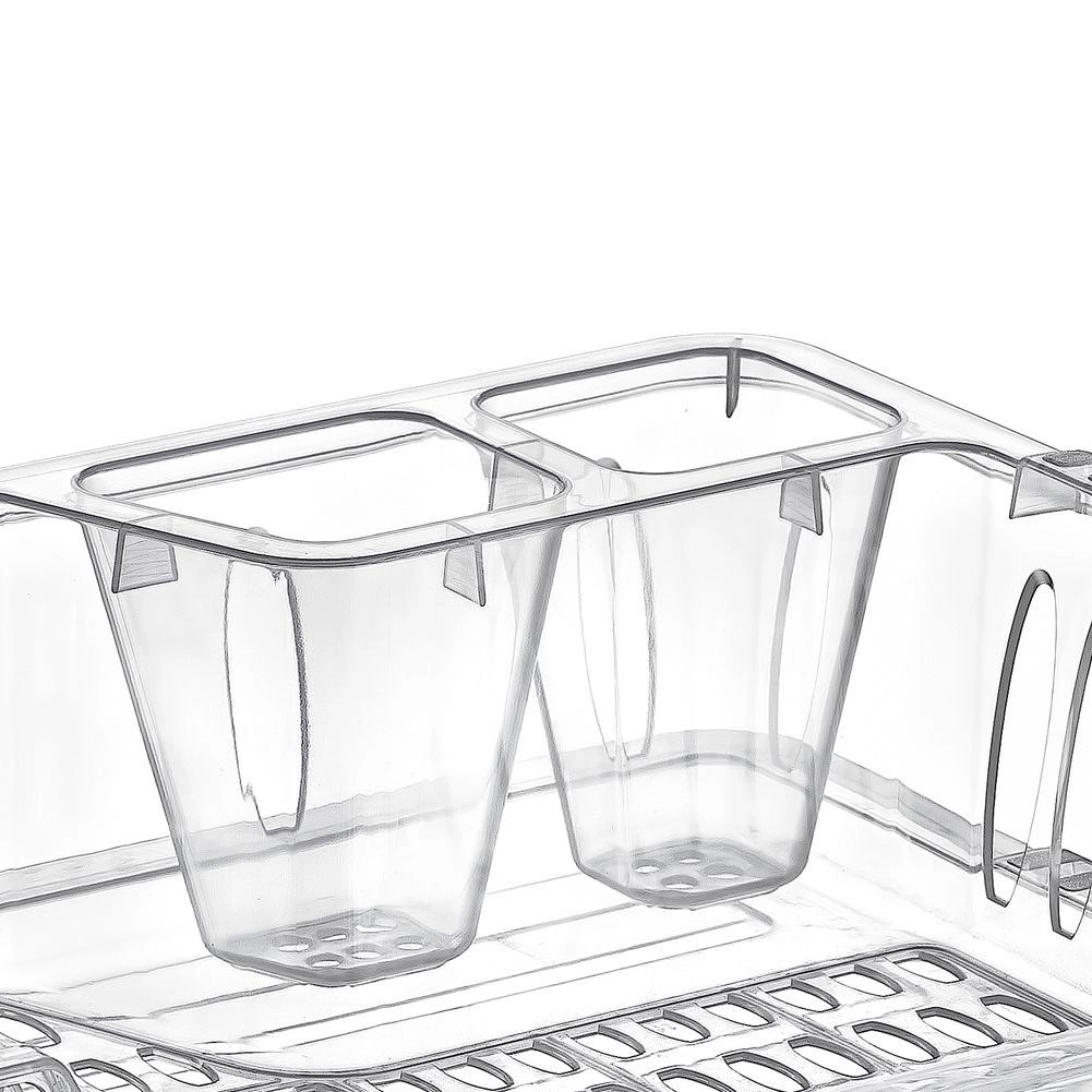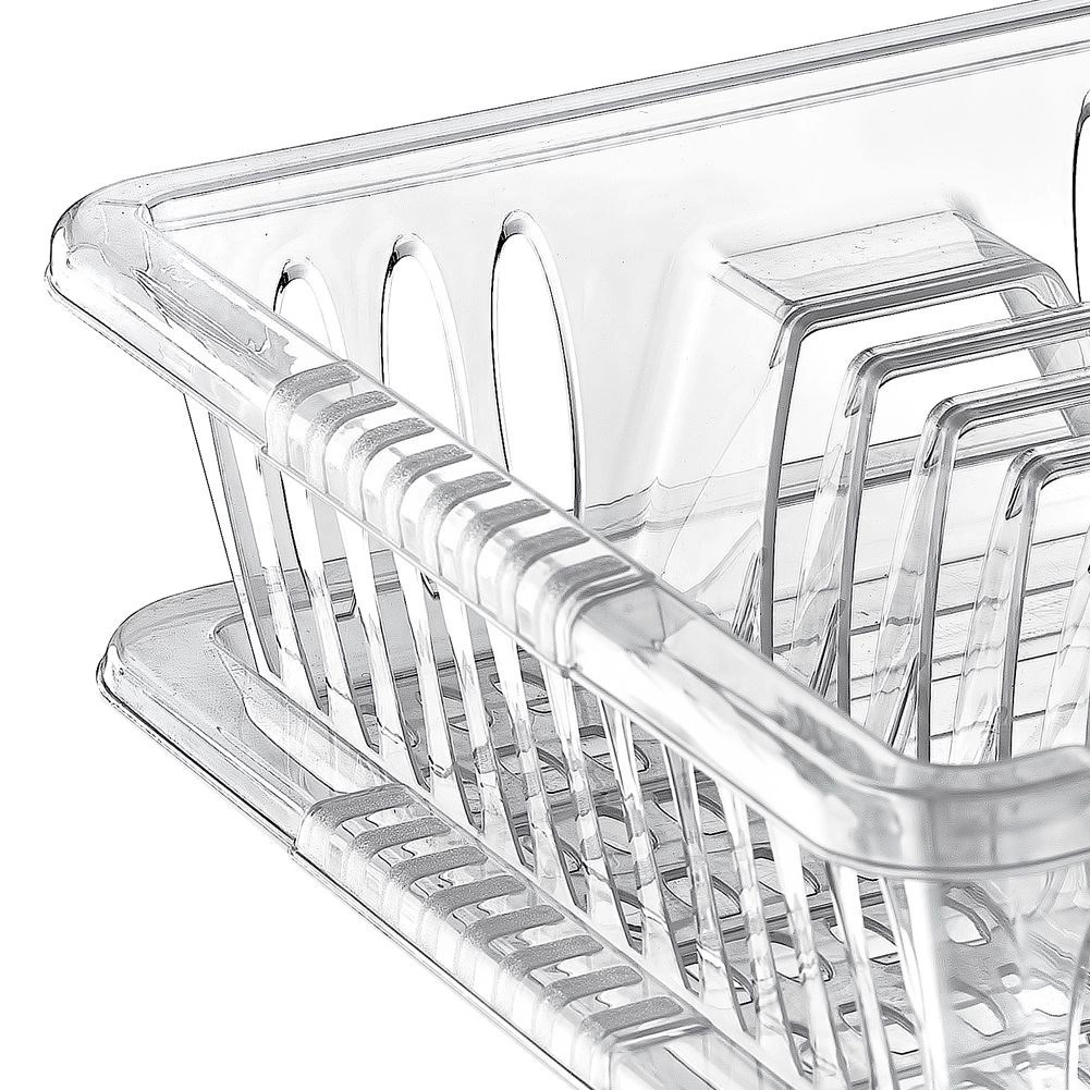 Escurreplatos compacto de 40 × 29 × 8,5 cm fabricado en plástico transparente de alta calidad sin BPA. Ofrece espacio para platos, tazas y dos compartimentos para cubiertos, cuenta con una bandeja de goteo extraíble para facilitar la limpieza y protege la encimera de la humedad.