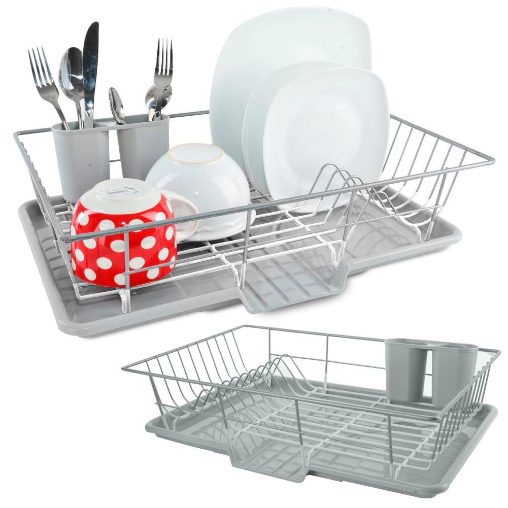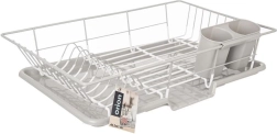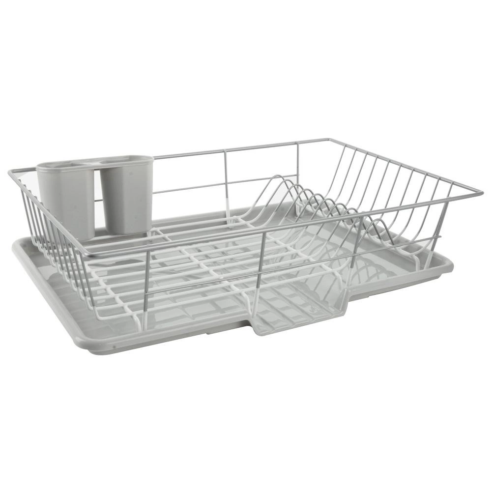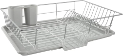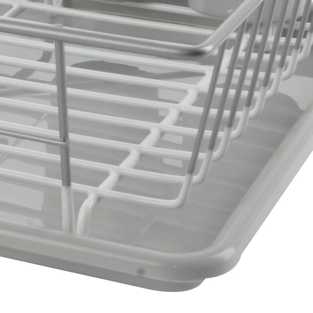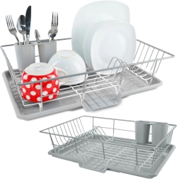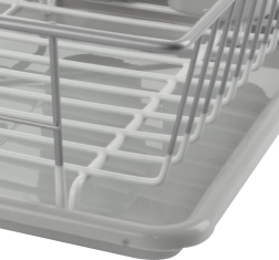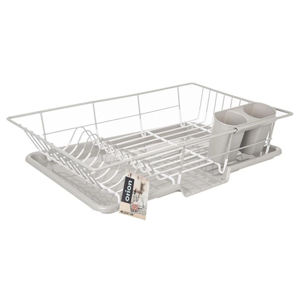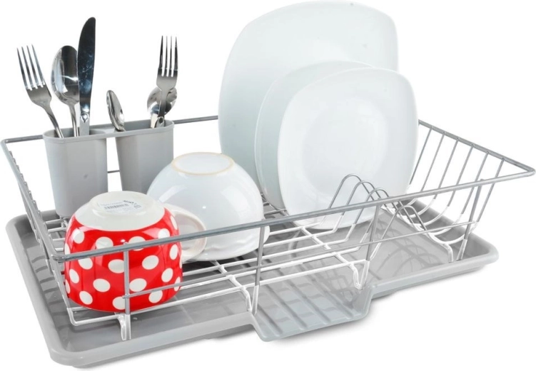 Elegante y práctico escurreplatos de 46,5 × 31 × 13 cm que permite secar cómodamente platos, cuencos, vasos y cubiertos sin que el agua se acumule en la encimera. La estructura metálica de acero inoxidable con acabado protector gris blanquecino es estable, resistente a la corrosión y fácil de limpiar.