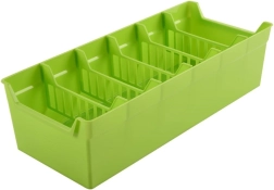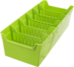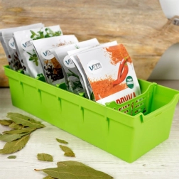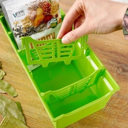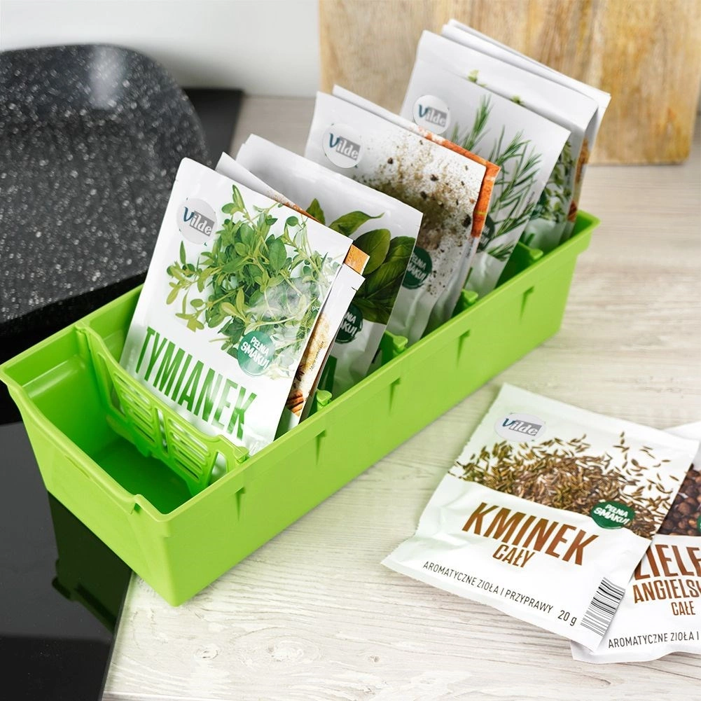 Organiza tus hierbas y especias de forma clara y elegante. El organizador verde para especias es ideal para guardar sobres de especias, tanto abiertos como cerrados. En su interior encontrarás cinco divisores extraíbles que dividen la caja en seis compartimentos, para que tengas suficiente espacio y orden en la cocina del día a día.