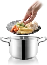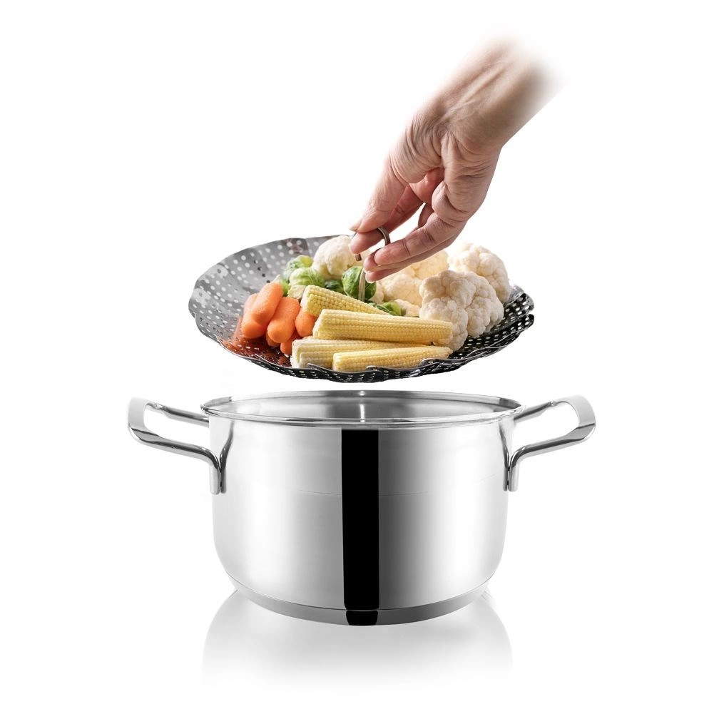 La cesta de vapor plegable de acero inoxidable de alta calidad permite una cocción al vapor suave, con la que los alimentos conservan su sabor, color y nutrientes. El diámetro ajustable de 14–23 cm asegura compatibilidad con ollas de distintos tamaños, para preparar desde verduras y pescado hasta dumplings.