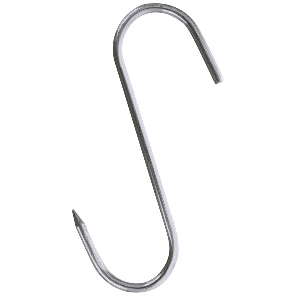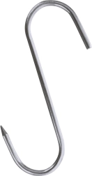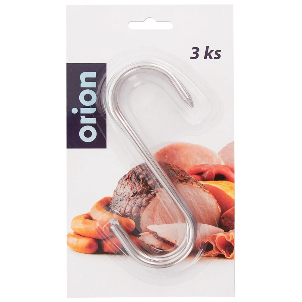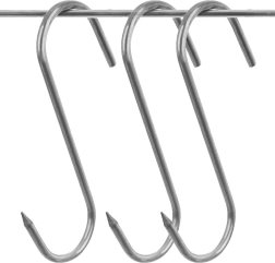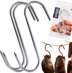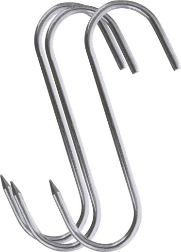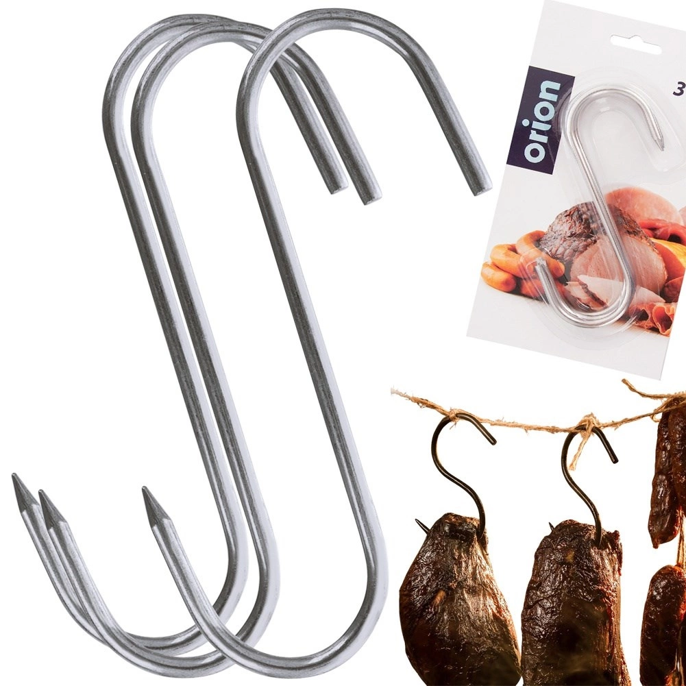Juego de tres ganchos de acero inoxidable para ahumador con dimensiones de 13,5 × 9 cm y diámetro de 0,5 cm, ideal para ahumado doméstico y profesional. El extremo afilado en un lado facilita ensartar piezas más grandes de carne, mientras que la forma abierta en S permite colgar rápidamente en las barras del ahumador.
