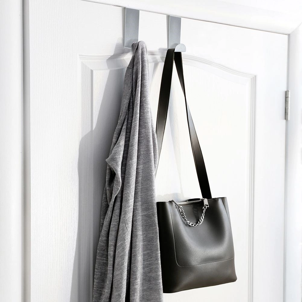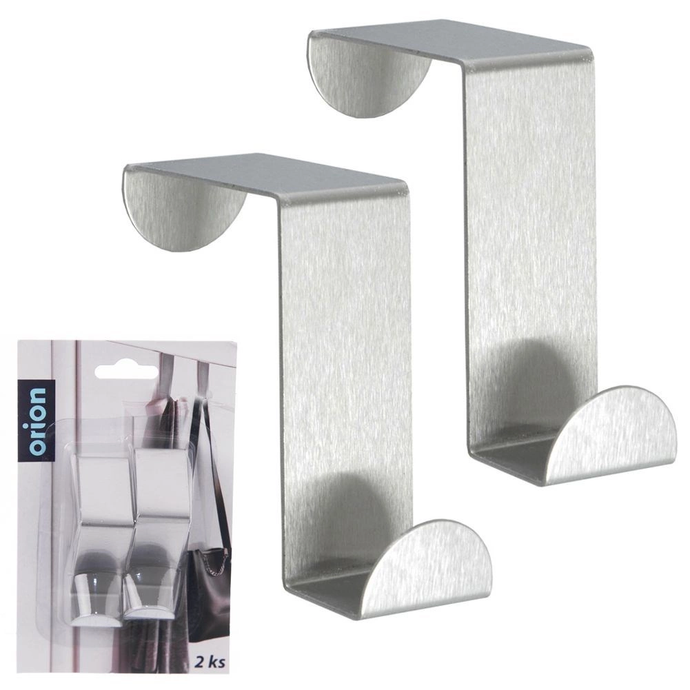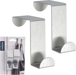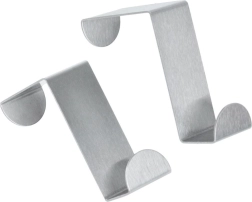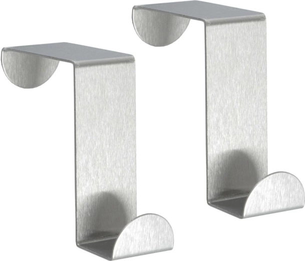 Práctico juego de dos ganchos para puerta de acero inoxidable mate en color plateado para ampliar rápidamente el espacio de almacenamiento sin taladrar. Adecuados para toallas, albornoces, bolsos o utensilios de cocina. Cada gancho mide 6 × 2,5 cm y se adapta a puertas de hasta 4 cm de ancho. La instalación es sin herramientas, el acabado es resistente de acero inoxidable y el uso es universal en baño, cocina, recibidor y dormitorio.