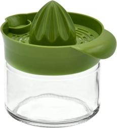 Clásico exprimidor de vidrio con cono de plástico y filtro integrado que permite exprimir cómodamente el zumo directamente en el recipiente. Sus dimensiones compactas y la base estable garantizan un uso seguro y rápido sin desorden.