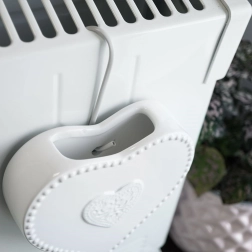 Este humidificador de cerámica blanco para radiador, con un delicado relieve de corazón, es una solución práctica contra el aire seco durante el periodo de calefacción. Solo hay que llenarlo con agua y colgarlo del radiador con el gancho metálico: el agua se evapora gradualmente y mejora el confort climático de la habitación.