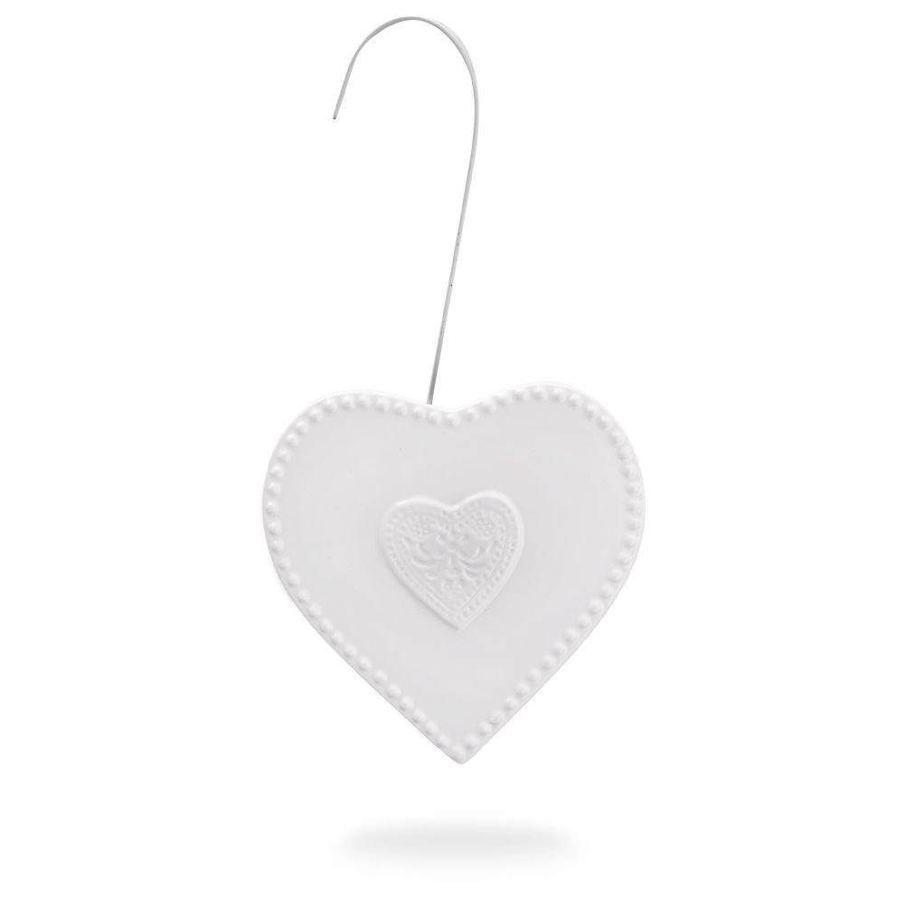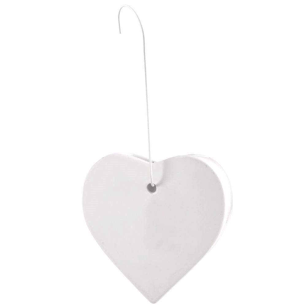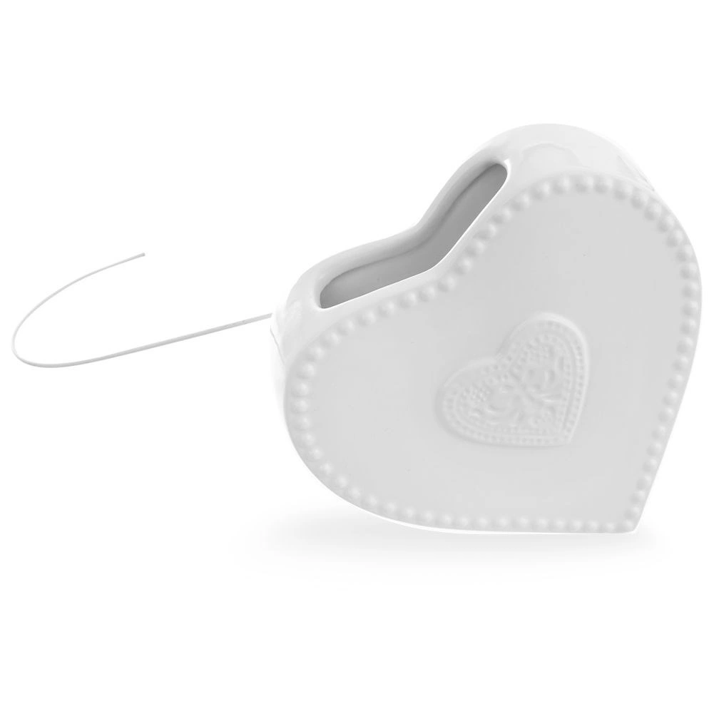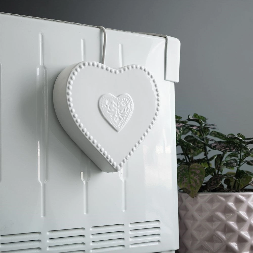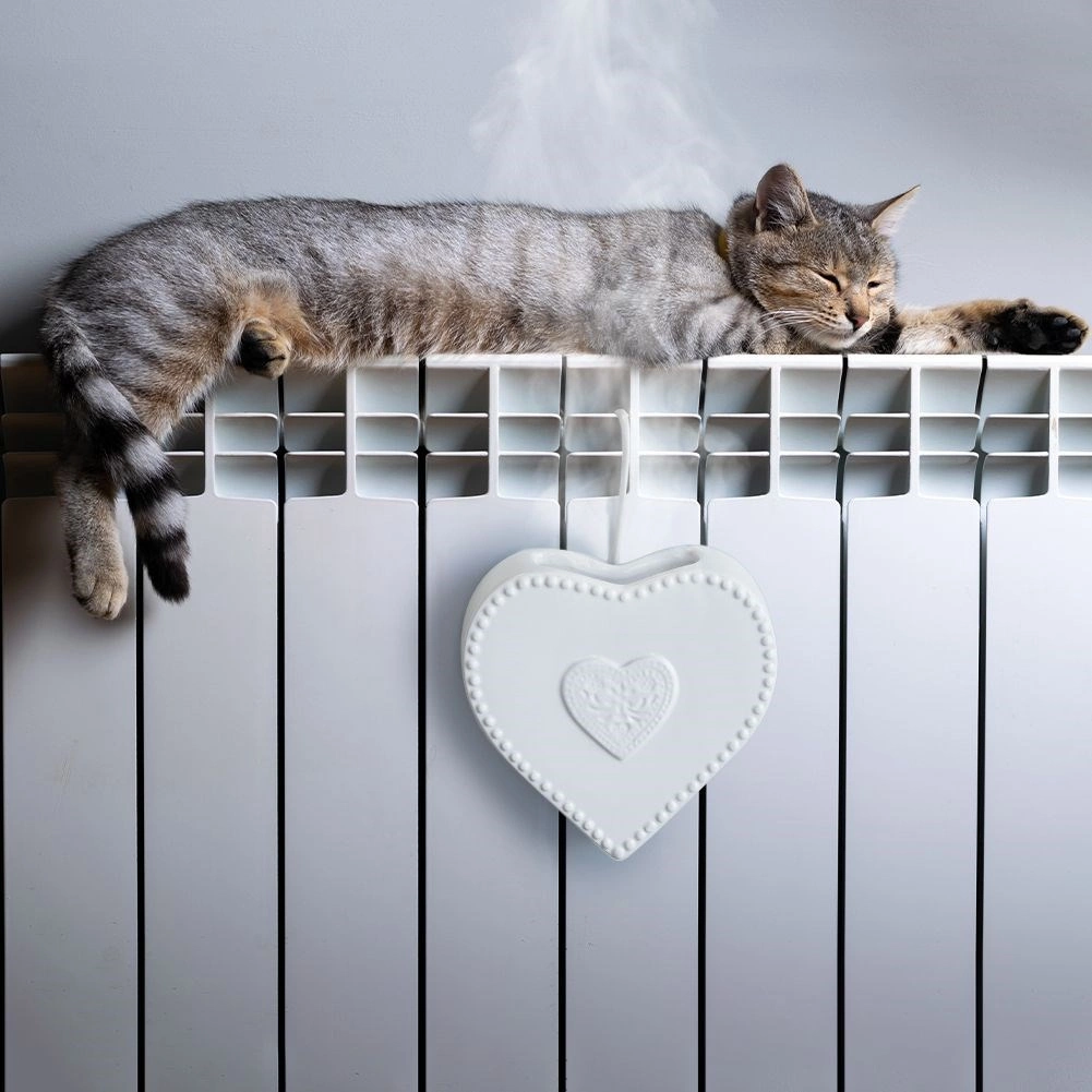 Elegante humidificador de aire de cerámica con forma de corazón para colgar en el radiador. Gracias a su capacidad de 200 ml, ayuda a mantener una humedad óptima durante la temporada de calefacción, con acabado brillante, uso sencillo y función como accesorio decorativo para cualquier interior.