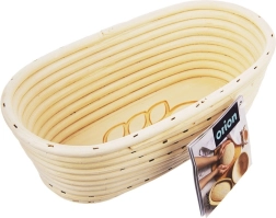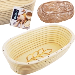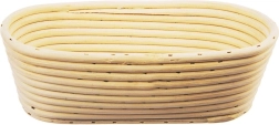 Banetón ovalado de ratán para pan con capacidad de aprox. 1 kg que ayuda a que la masa fermente correctamente y mantenga la forma. De ratán natural en color beige, con motivo decorativo de espiga y acanalado para un patrón espiral tradicional en la corteza. Apto para panadería doméstica y gastronomía. Estabiliza la forma de la masa, favorece la circulación del aire y crea un atractivo patrón rústico en la hogaza.