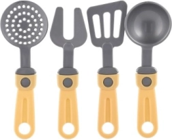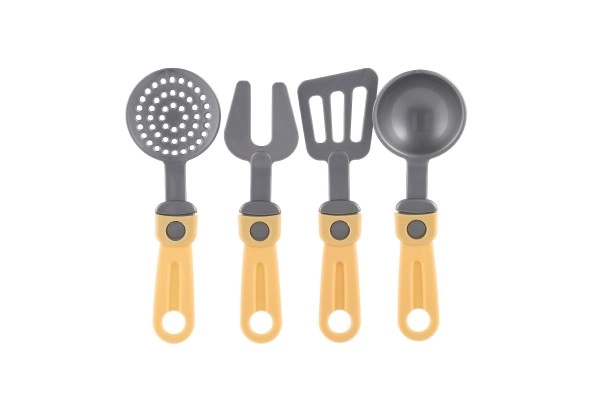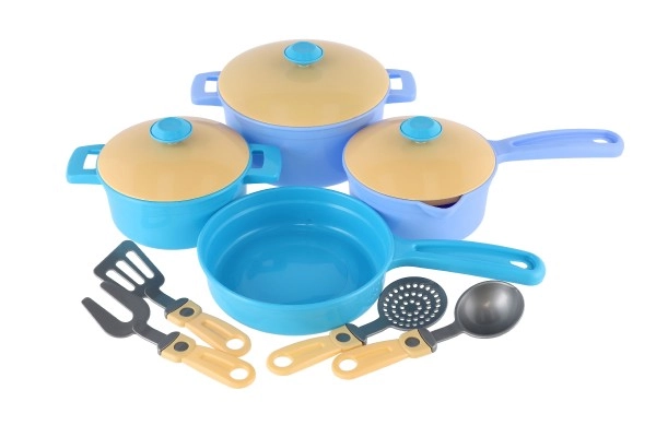El set incluye tres ollas con tapas y cuatro utensilios de cocina diferentes, ideal para varios tipos de actividades culinarias imaginarias.