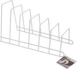 Práctico organizador de cocina de metal para almacenamiento vertical de hasta 6 piezas: tapas, platos o tablas de cortar. La estructura de alambre estable en color blanco ahorra espacio en armarios y cajones, garantiza la organización y protege las tapas de los arañazos. Se limpia fácilmente y encaja a la perfección en cocinas modernas y clásicas.