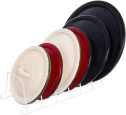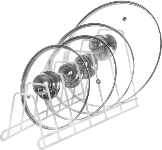 El soporte es adecuado para distintos tamaños y tipos: desde tapas con pomo hasta platos llanos y tablas de cortar; para el armario o la encimera.