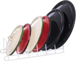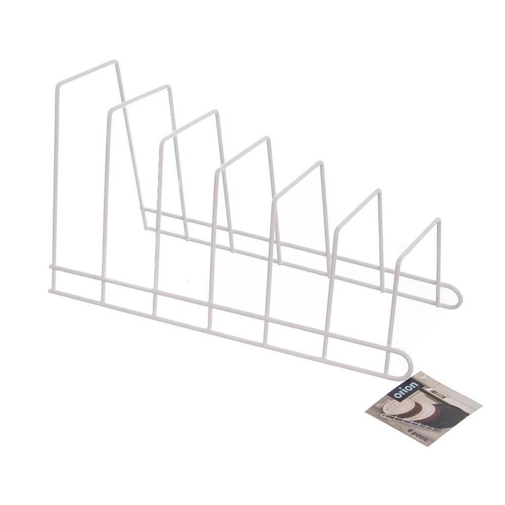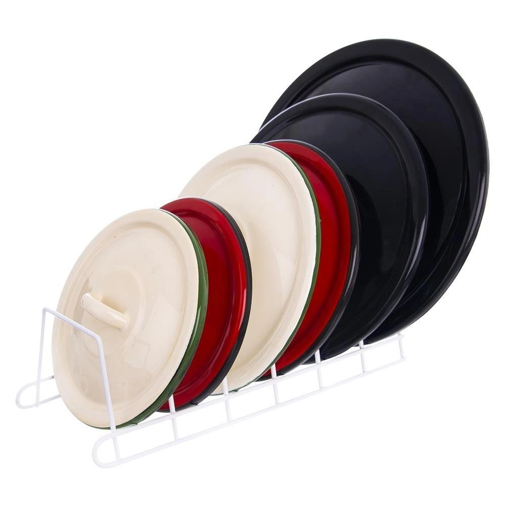 Mantén el orden en la cocina con este soporte compacto con separación para 6 posiciones. La estructura abierta de alambre mantiene tapas, platos llanos y tablas bien organizados y de rápido acceso, a la vez que evita que se deslicen y se dañen. Puedes colocarlo sobre la encimera, dentro de un armario o en un cajón profundo.