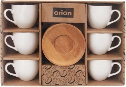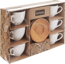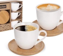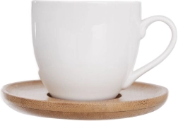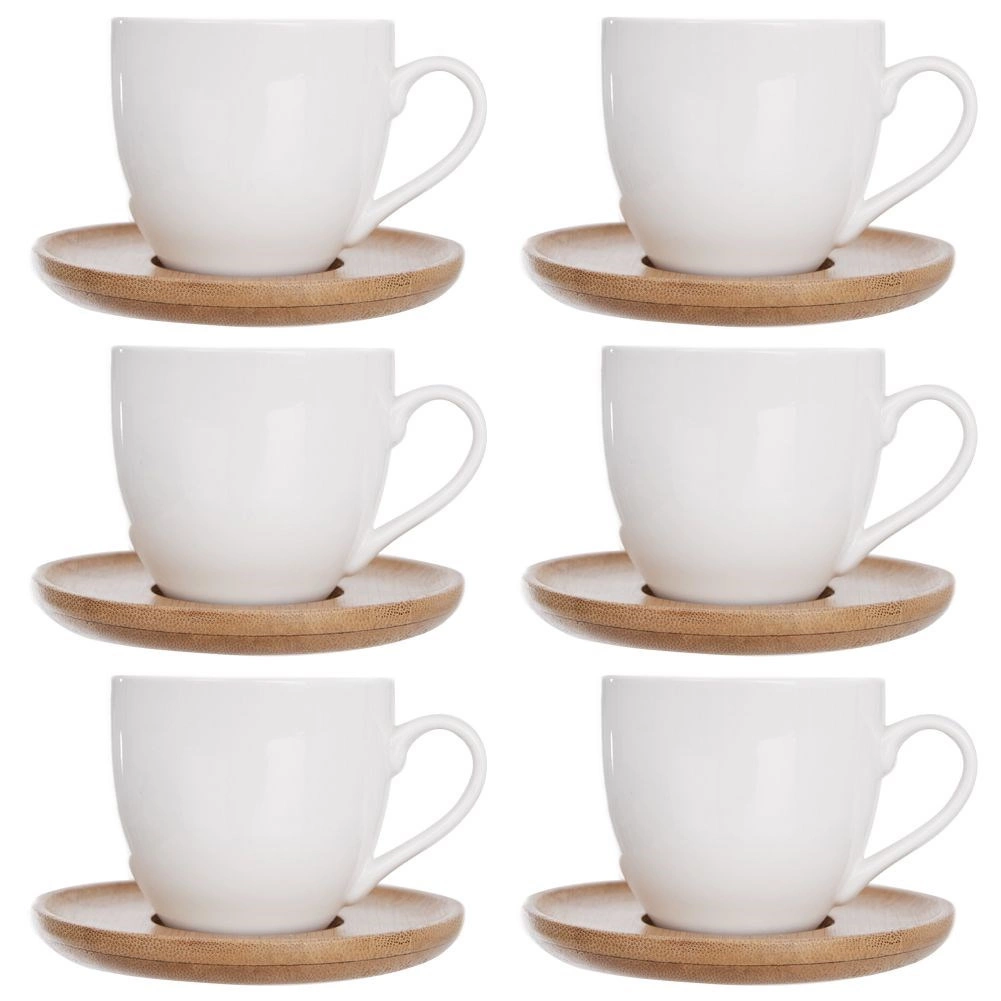Elegante juego de seis tazas de porcelana con platillos de bambú para servir espresso con estilo. Diseño minimalista, porcelana de calidad y prácticos platillos de bambú que protegen la superficie. Las tazas tienen capacidad de 100 ml, una asa ergonómica y se pueden lavar en lavavajillas (sin los platillos).