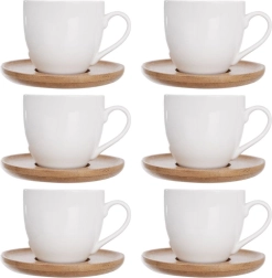 Seis tazas de porcelana blanca con platillos de madera forman un conjunto armonioso y decoran cualquier mesa. Ideal para baristas en casa y también como regalo.
