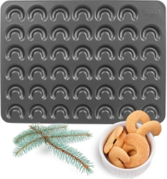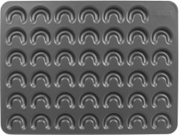 Este molde de chapa de alta calidad permite hornear de forma rápida y eficiente pequeños cuernitos con un formato perfectamente uniforme. La capa antiadherente minimiza el uso de grasa, evita que se pegue y facilita el desmoldado sin dañar la masa delicada. Gracias a sus dimensiones de 42 × 32 × 0,7 cm y a sus 41 cavidades, ahorrarás tiempo y energía.