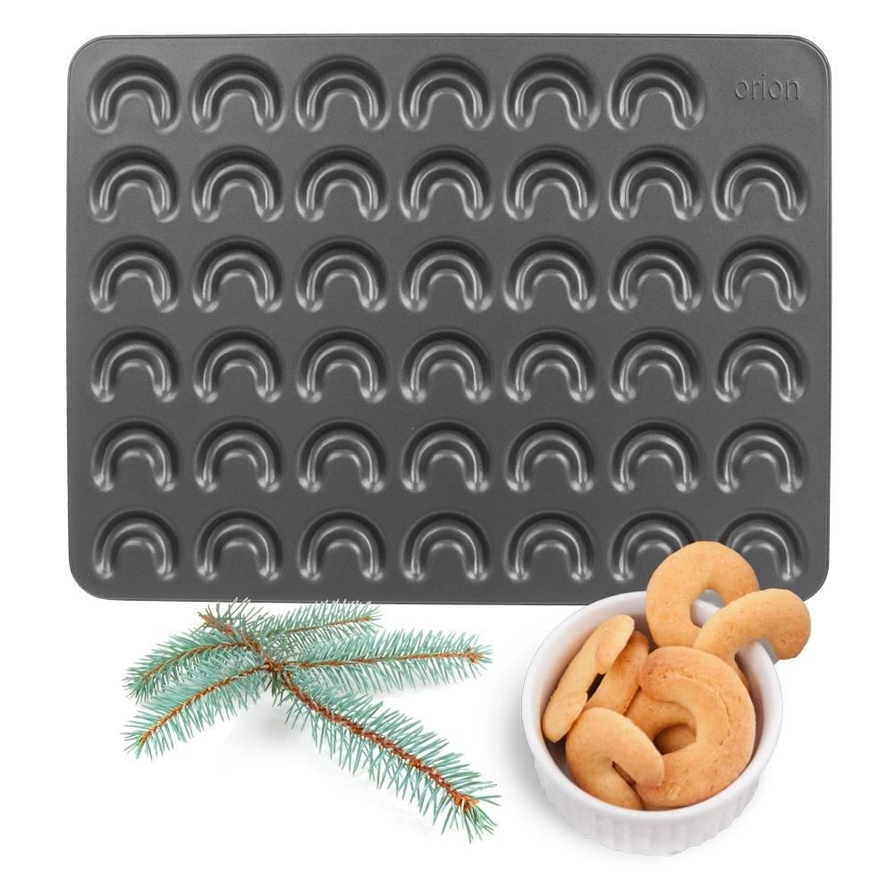 El molde está hecho de acero al carbono, que garantiza una distribución uniforme del calor y resultados fiables. Es ideal para cuernitos, galletas y bocados salados. Para un mejor resultado, recomendamos engrasar ligeramente la superficie antes de hornear. Producto original de la marca ORION fabricado conforme a las normas europeas.