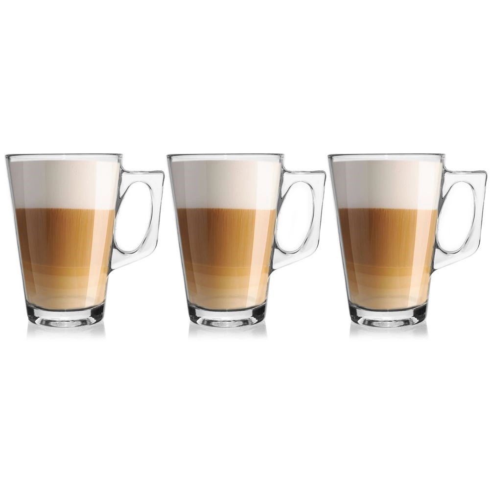 Elegante juego de tres vasos con capacidad de 240 ml que encantará a los amantes del café y del té. Cada vaso está hecho de vidrio resistente con asa cómoda y tiene una forma moderna para un servicio con estilo. Apto para lavavajillas, ideal para bebidas calientes y frías. Vidrio resistente, asa cómoda, uso universal, diseño moderno.