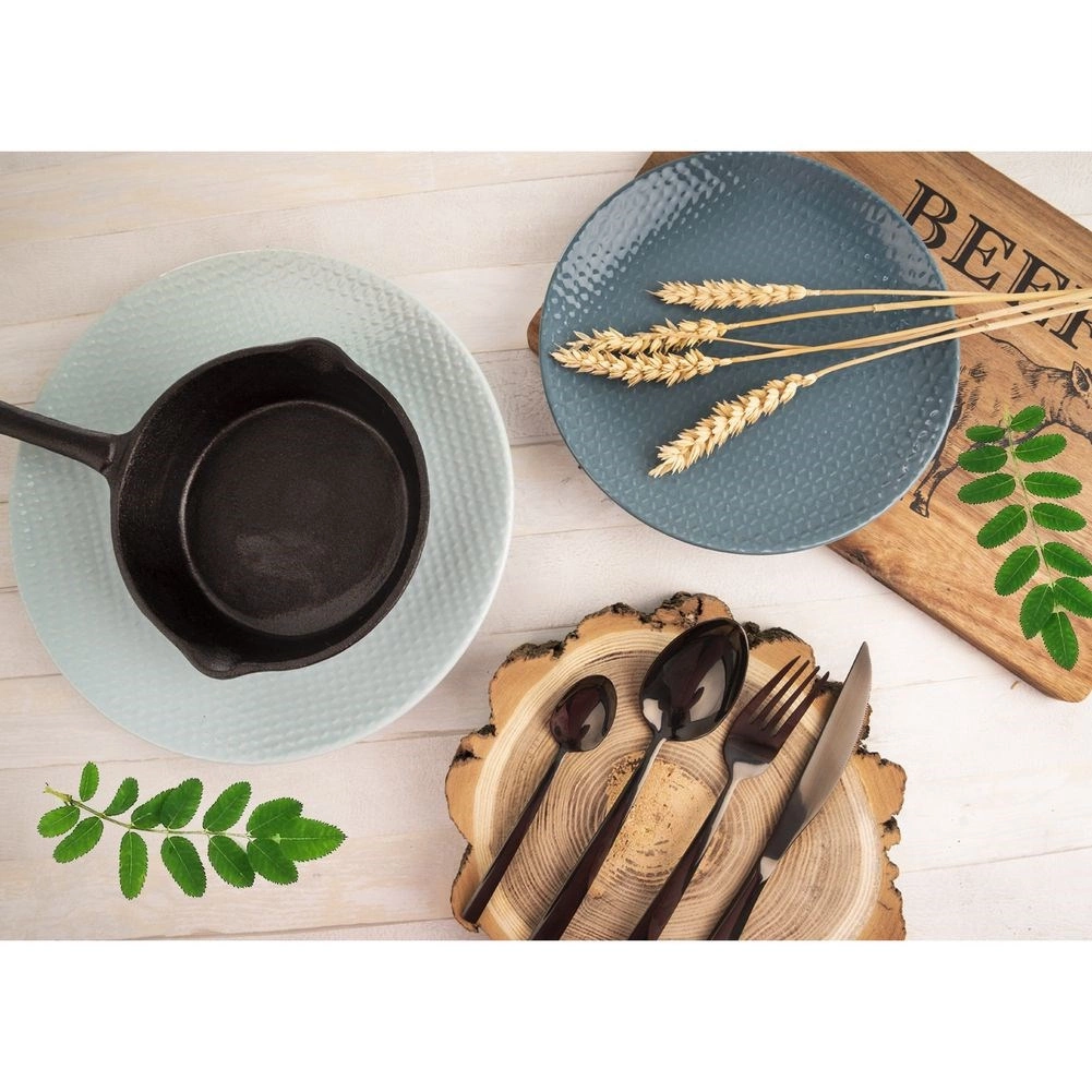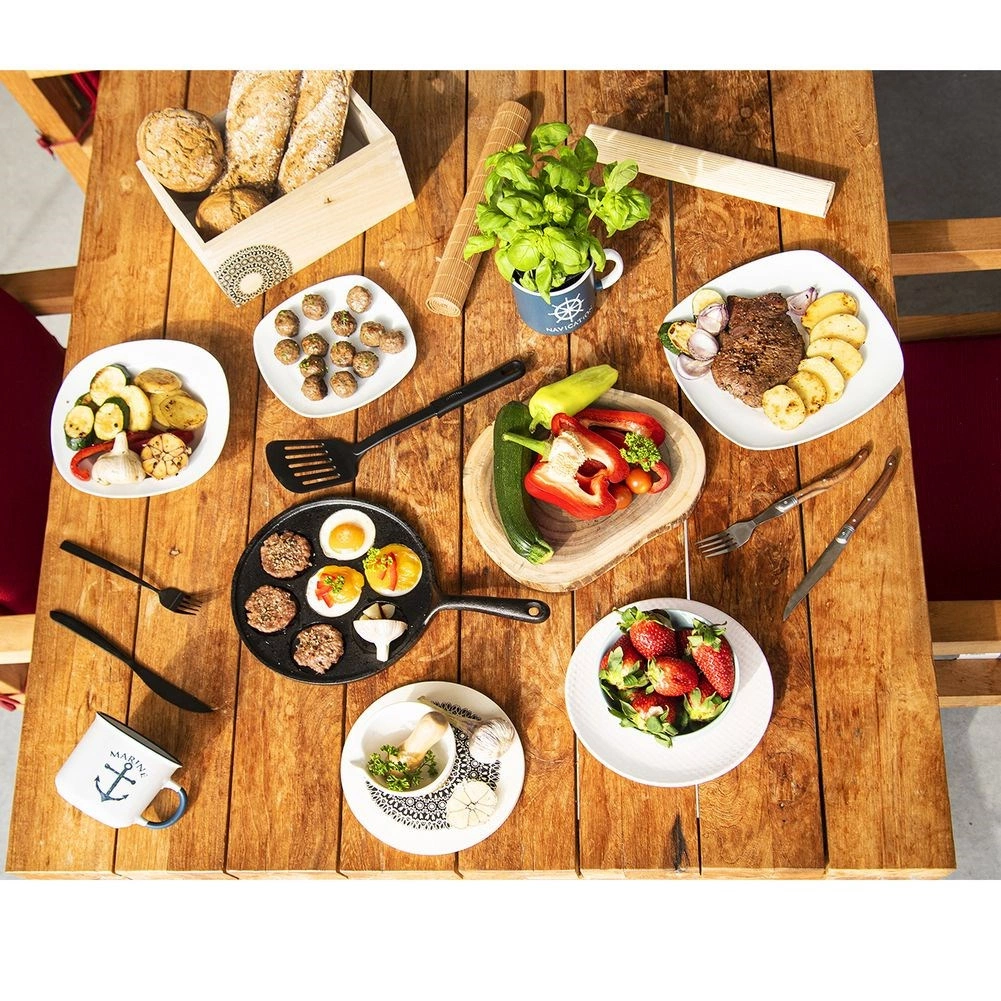 El conjunto incluye todo lo necesario para una experiencia de mesa cómoda: 6× cucharas soperas (21,5 cm, ancho 4,5 cm), 6× tenedores (21 cm), 6× cuchillos (23,5 cm) y 6× cucharillas de té (14 cm). Acero inoxidable duradero y acabados de calidad garantizan una larga vida útil. Apto para lavavajillas; sin embargo, para mantener el aspecto impecable, recomendamos un lavado manual suave.