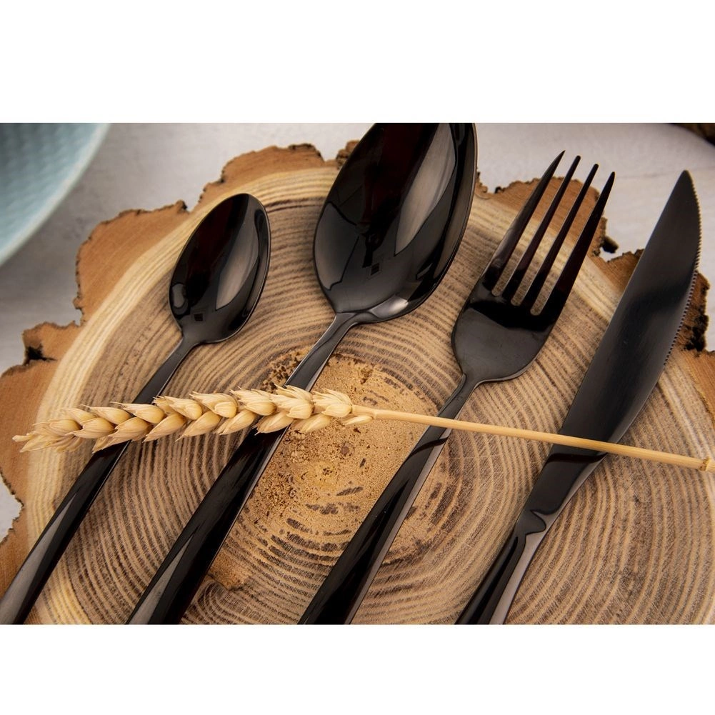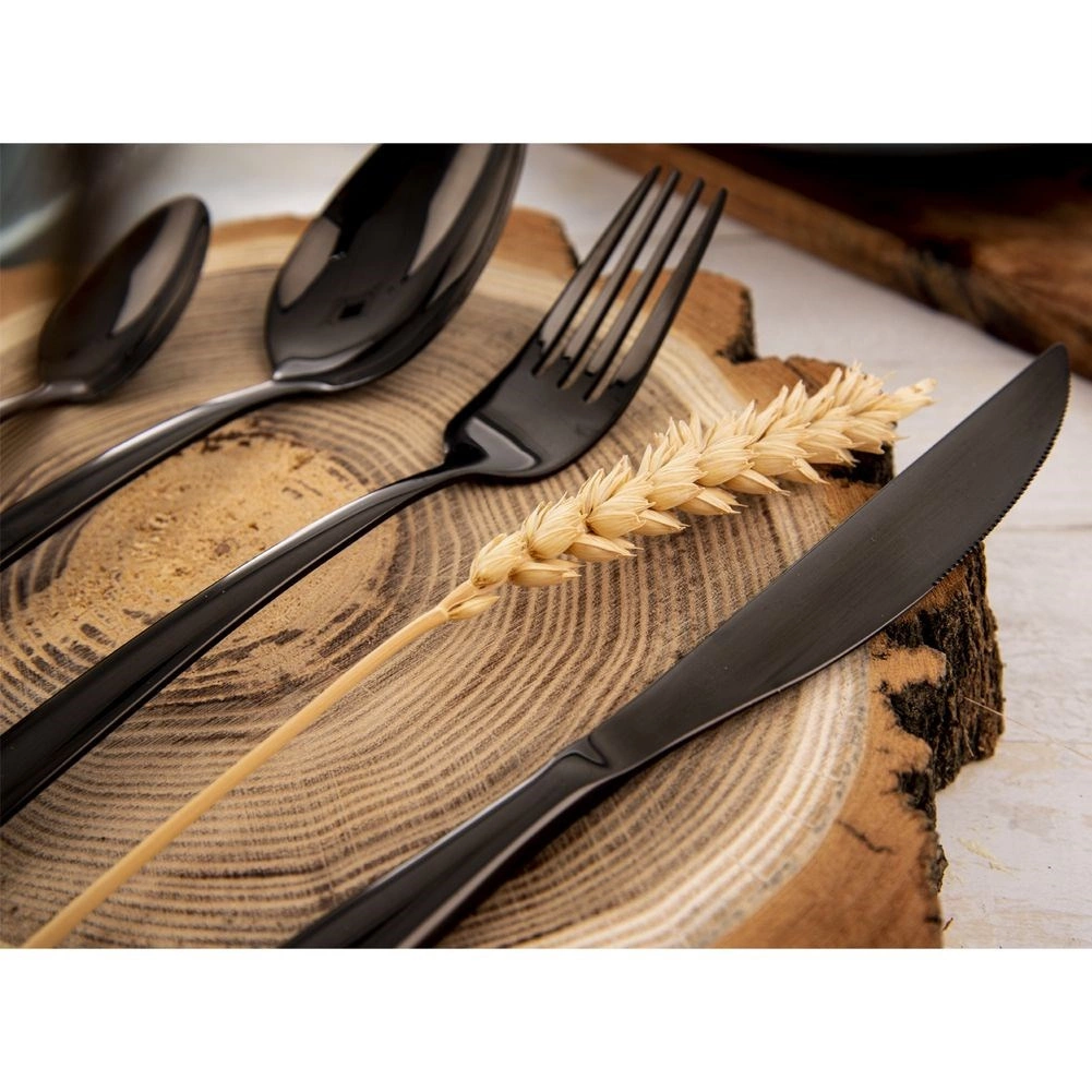 El juego de cubiertos ORION Black Luxury destaca por su aspecto moderno y su construcción resistente. La superficie negra y brillante con acabado PVD aporta un carácter excepcional a tu mesa y combina muy bien tanto con vajilla clásica como moderna. Ideal para cenas familiares, banquetes festivos y uso cotidiano.
