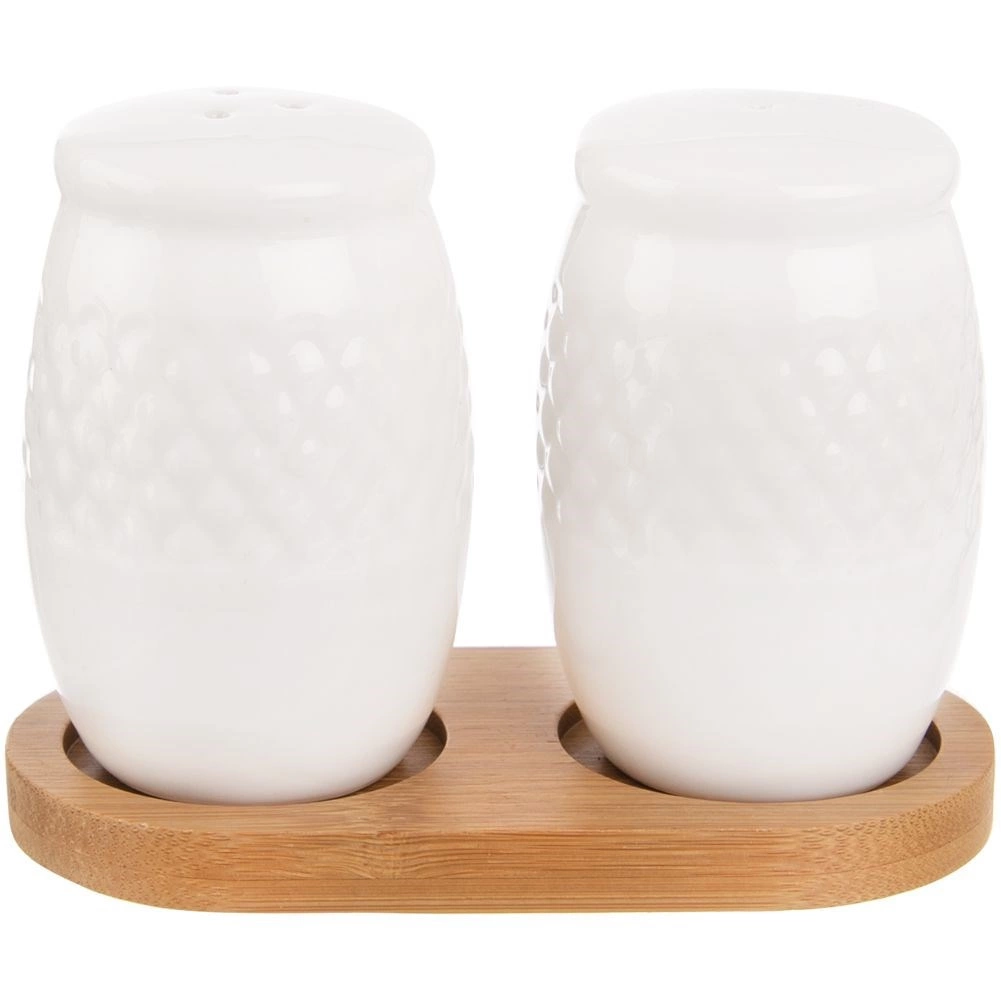 Elegante juego de dos especieros de porcelana para sal y pimienta con soporte de bambú para el uso diario en la mesa y el servicio. El esmaltado de porcelana blanco con delicado relieve aporta un estilo atemporal, la base de bambú mantiene todo ordenado y a mano, y los orificios de fácil dosificación en la parte superior garantizan un sazonado preciso. Apto para lavavajillas para un mantenimiento cómodo.
