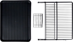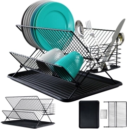 El escurridor está fabricado en metal resistente con un elegante acabado negro, cuenta con patas antideslizantes para mayor estabilidad y una bandeja plástica extraíble para vaciar el agua y limpiar con facilidad. Su estructura plegable ahorra espacio cuando no necesitas la capacidad completa.
