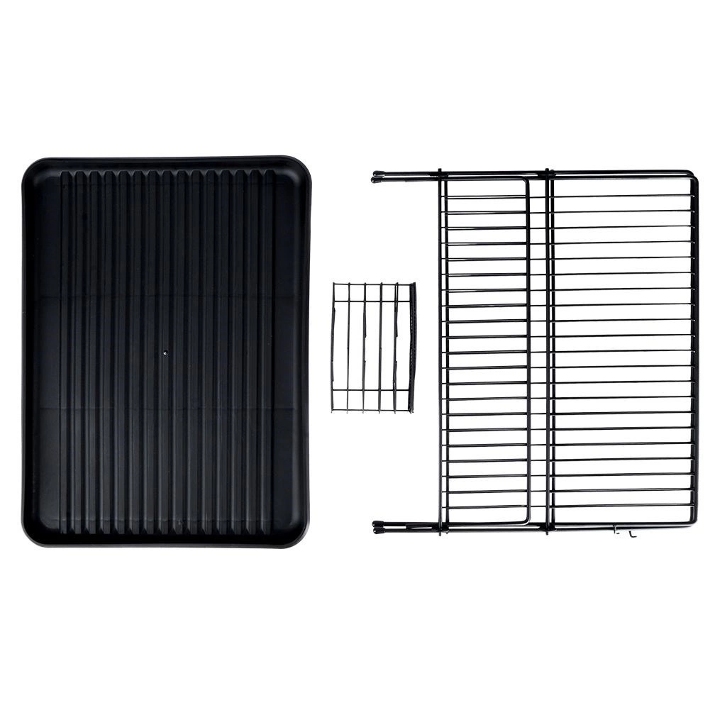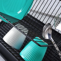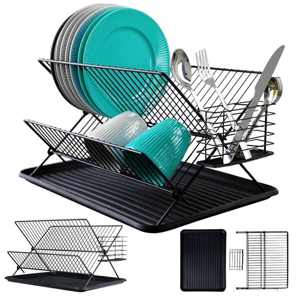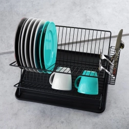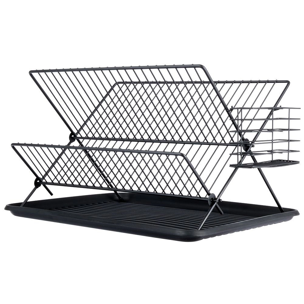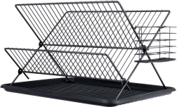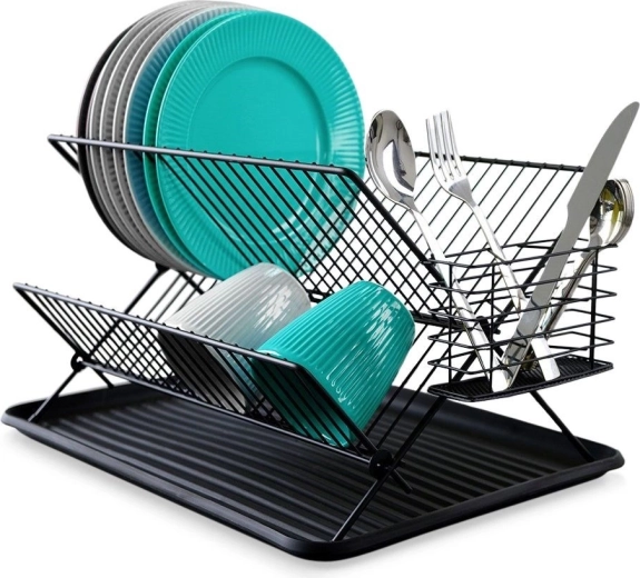 Elegante escurridor de vajilla de dos niveles en color negro, con dimensiones de 45 × 32 × 25,5 cm, que organiza y seca rápidamente platos, cuencos, tazas y cubiertos. Gracias a su robusta estructura metálica, patas antideslizantes y bandeja de goteo extraíble, mantiene tu encimera seca y limpia. Su moderno diseño industrial encaja a la perfección en cualquier cocina.