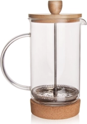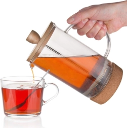 - Materiales de calidad: vidrio de borosilicato, acero inoxidable, tapa de bambú y base de corcho extraíble.