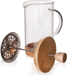Elegante french press de vidrio con capacidad de 750 ml para una preparación sencilla de café, té y hierbas. Combina vidrio de borosilicato resistente al calor, émbolo de acero inoxidable con filtro fino y tapa de bambú con base de corcho extraíble. Ofrece servicio cómodo gracias al pico vertedor y al asa, mantenimiento fácil y sabor limpio sin sedimentos.