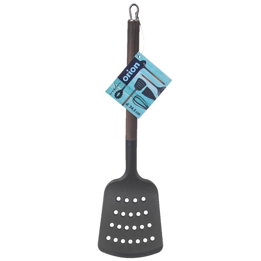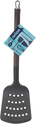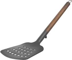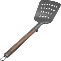 La espátula WOODEN de 34,5 × 9 cm está fabricada en termoplástico PBT de alta calidad, caracterizado por su gran rigidez y resistencia. El mango metálico con acabado efecto madera garantiza un agarre cómodo y un aspecto elegante que encaja en cocinas tanto tradicionales como modernas.