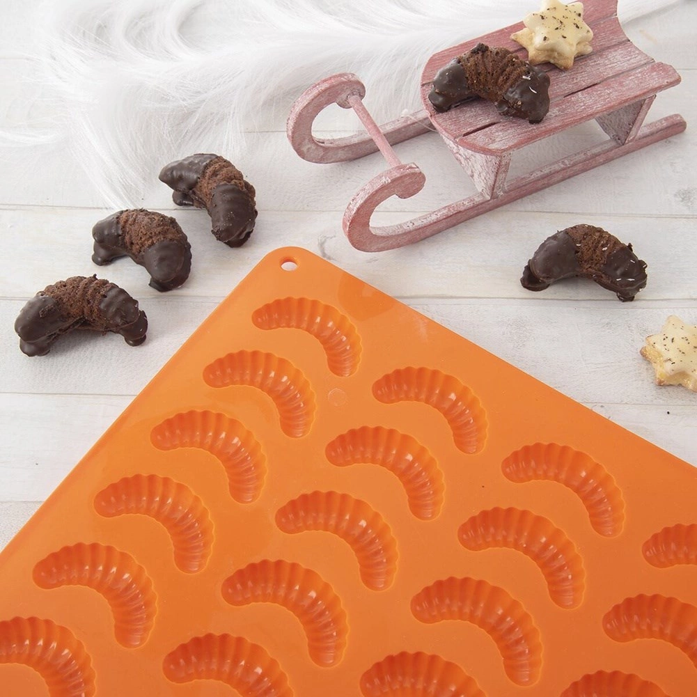 Práctico molde de silicona para hornear que da forma a hasta 30 cuernitos frágiles a la vez. Es antiadherente, flexible y resistente a temperaturas de -40 °C a +220 °C. Apto para horno, microondas y congelador, y lavable en lavavajillas.
