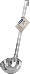 Práctico cucharón de cocina con capacidad de 300 ml y longitud de 35 cm, fabricado en acero inoxidable de alta calidad para servir fácilmente sopas, salsas o gulash. Resistente, ligero y fácil de limpiar, con posibilidad de colgar para un almacenamiento cómodo.