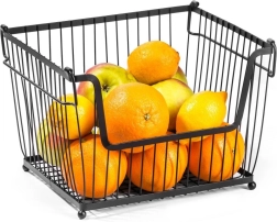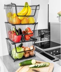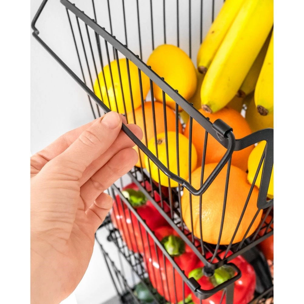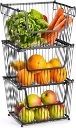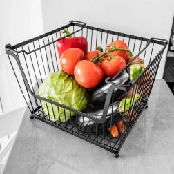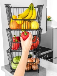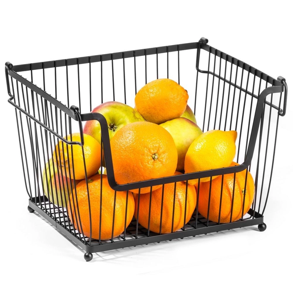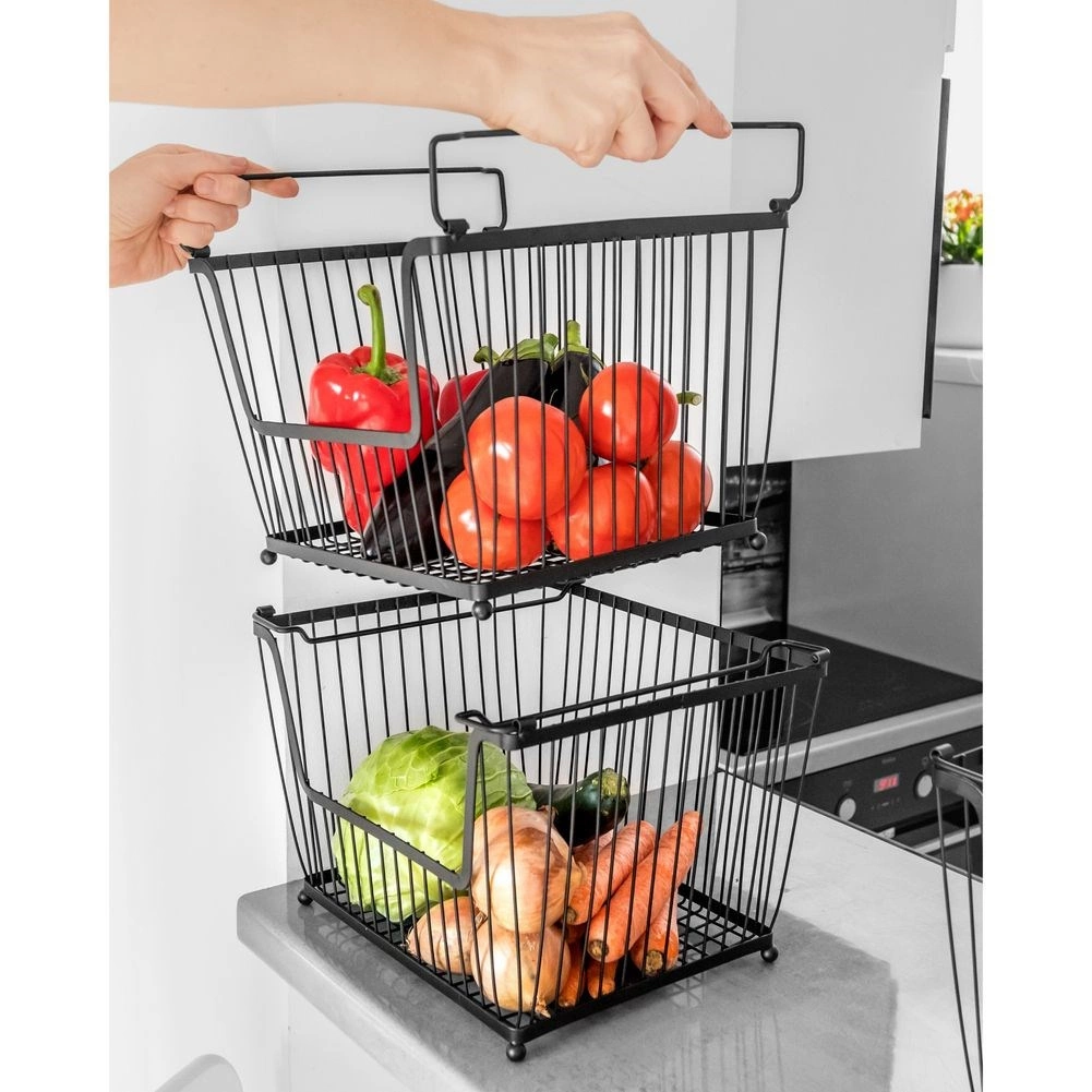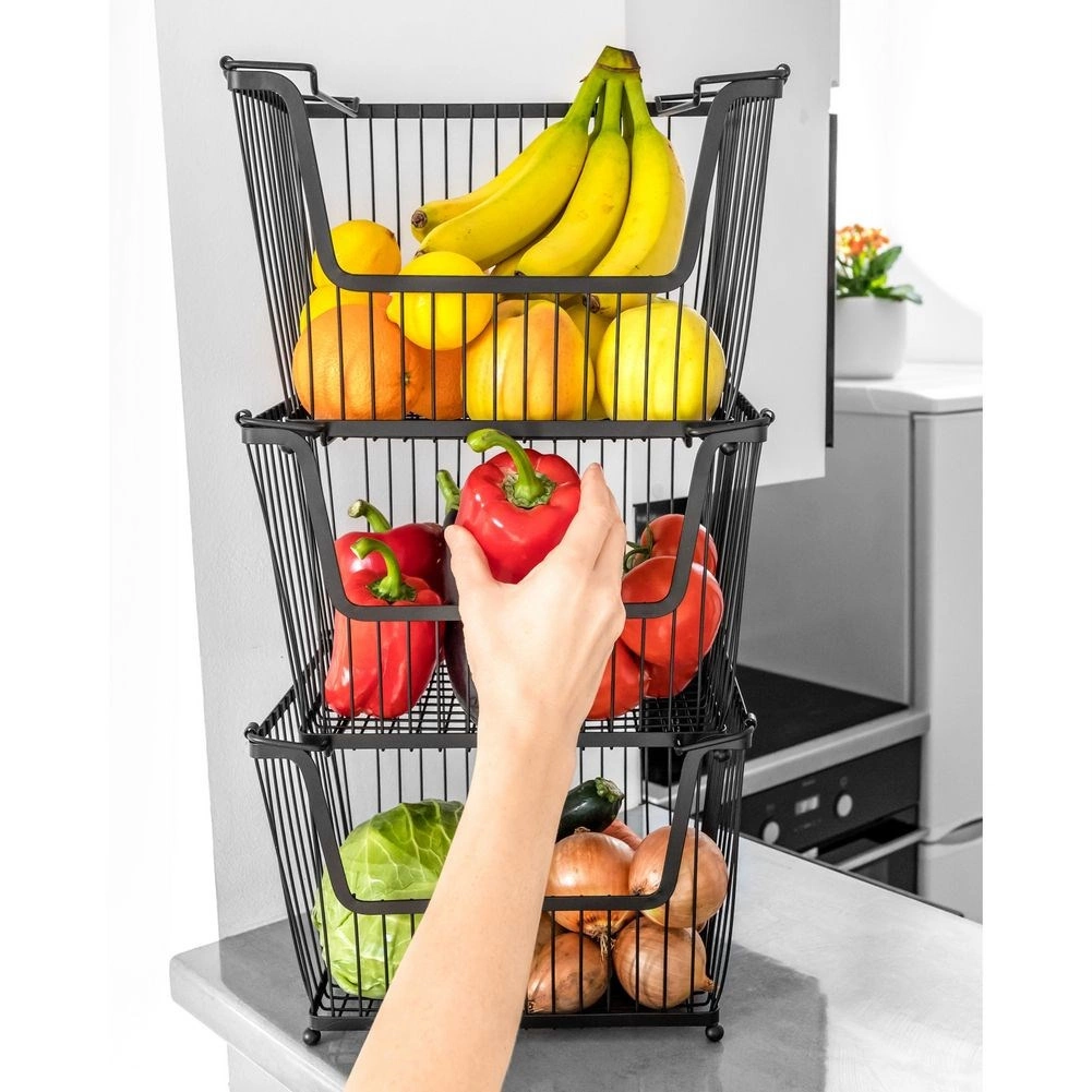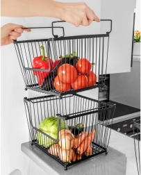 Varias cestas se pueden apilar para crear un práctico soporte de varios niveles que mantiene la cocina ordenada y aprovecha el espacio vertical.