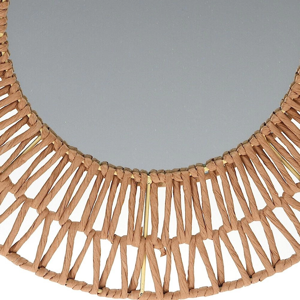 Este espejo de pared redondo es un accesorio de diseño en estilo natural. El marco de papel trenzado sobre una sólida estructura metálica crea una textura llamativa que destaca en interiores de estilo boho, escandinavo o minimalista moderno. Los tonos neutros beige‑gris se combinan fácilmente con diversos colores y materiales.