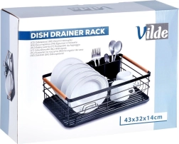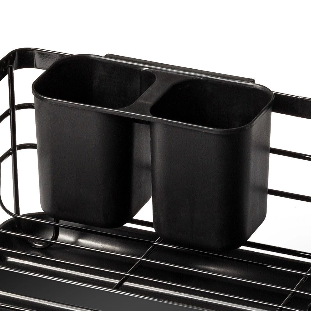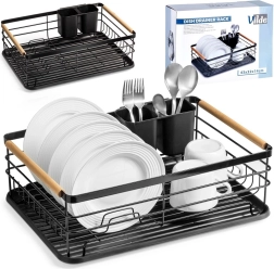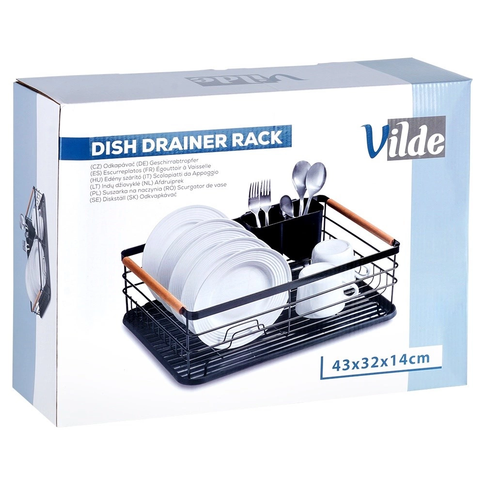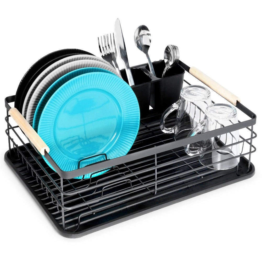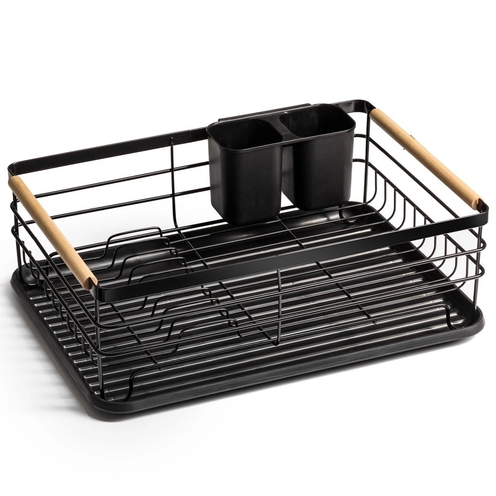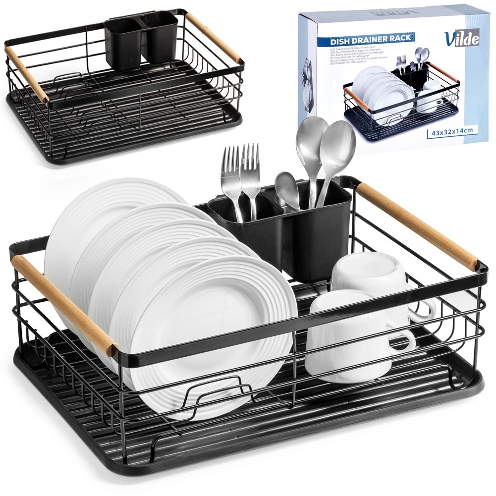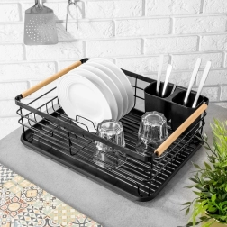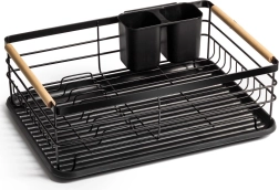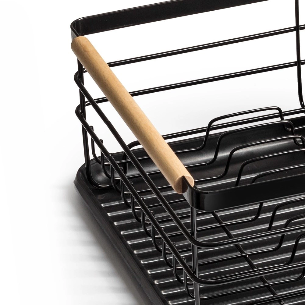 Práctico escurridor de platos de 43 × 32 × 14,5 cm que facilita el secado y la organización de platos, vasos y cubiertos, protegiendo a la vez la encimera de la cocina. Está fabricado en metal resistente de color negro, cuenta con una bandeja de goteo extraíble y un cesto para cubiertos de dos compartimentos. Gracias a su capacidad para hasta 10 platos, su estructura de alambre robusta y sus asas de bambú, es cómodo de transportar y usar a diario. Su diseño industrial con estilo encaja a la perfección en cocinas modernas y clásicas.