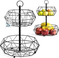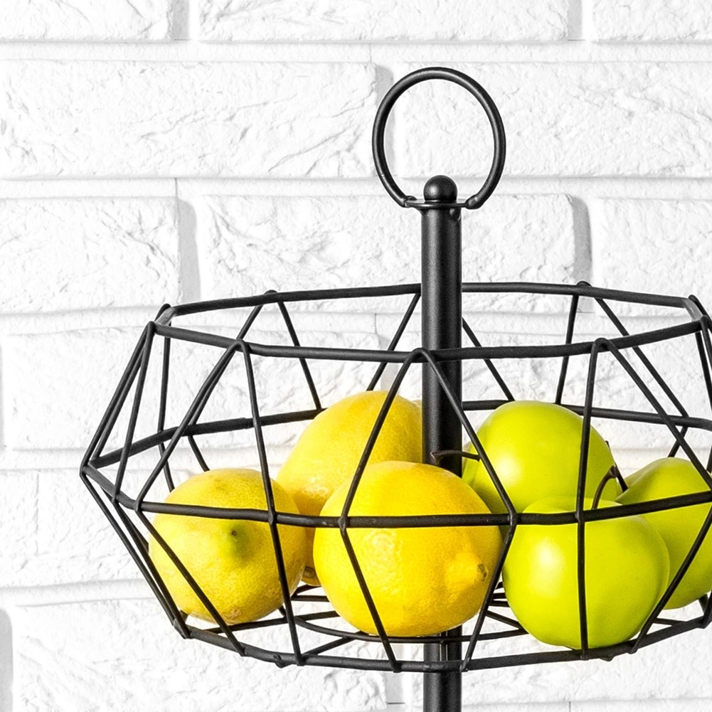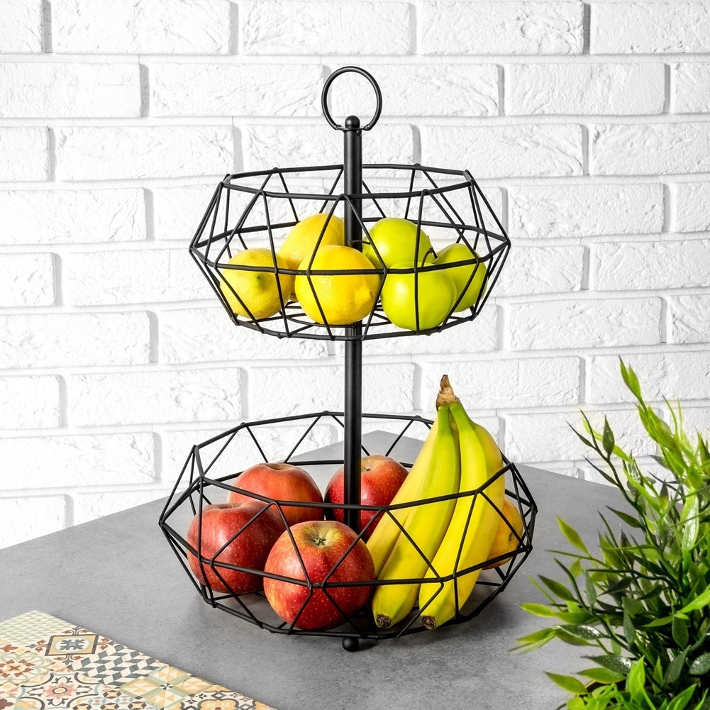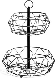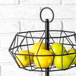 Elegante cesta de dos niveles fabricada en estructura metálica de alambre en color negro que ofrece almacenamiento práctico de frutas y verduras con circulación natural del aire. Gracias a su diseño geométrico moderno, encaja perfectamente en interiores modernos, industriales y glamur, y además es estable, fácil de transportar y sencilla de mantener.