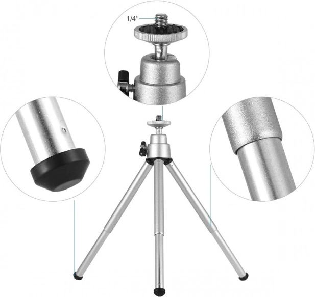 Este trípode compacto está fabricado en aluminio de calidad, lo que garantiza alta resistencia y solidez estructural. Es perfecto para fotografía macro gracias a la posibilidad de ajustar a cualquier posición mediante una cabeza móvil que se desplaza en tres direcciones. La rosca universal de 1/4'' es compatible con la mayoría de cámaras y videocámaras.