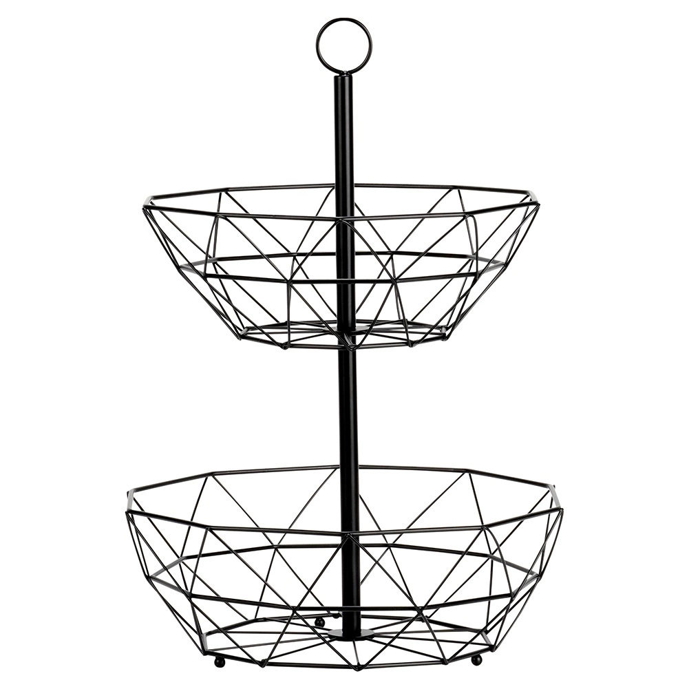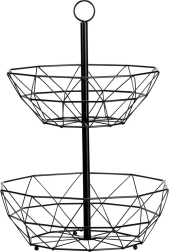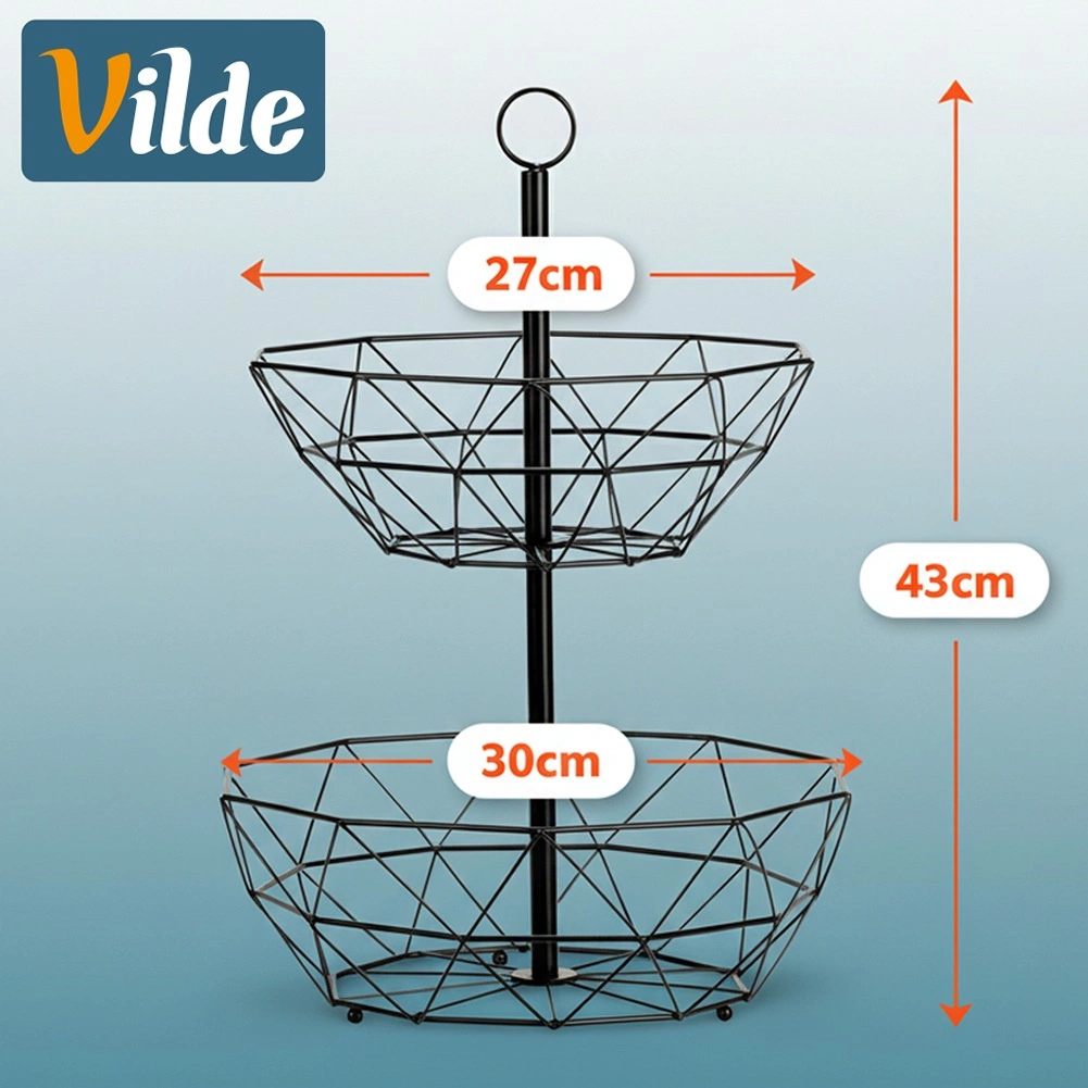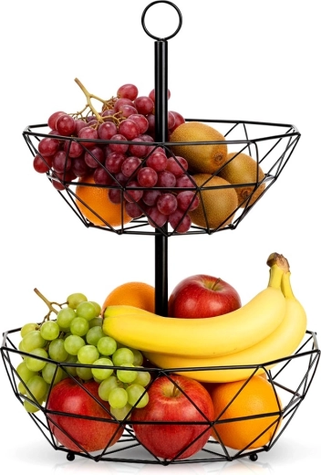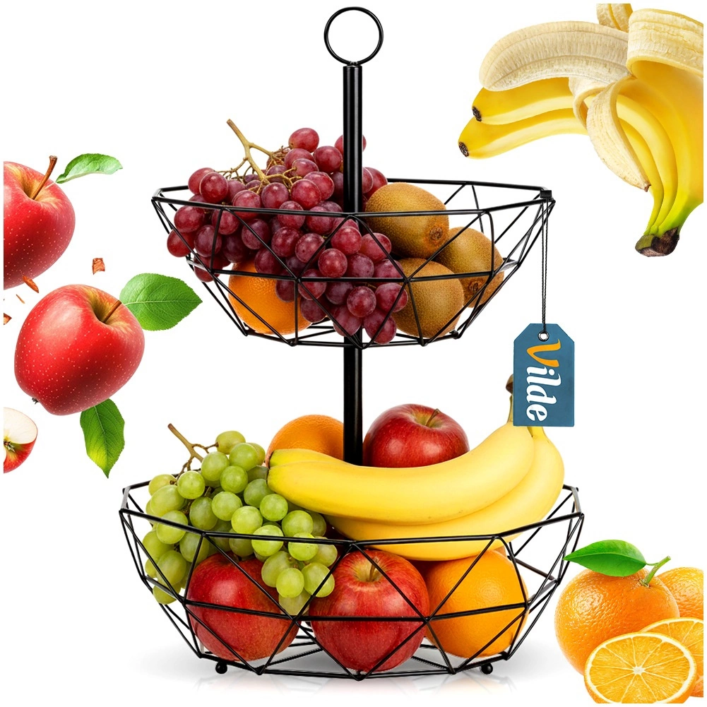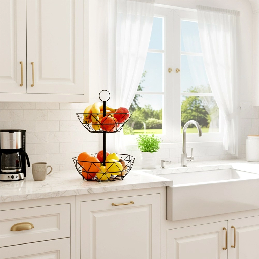 La cesta de alambre de dos niveles es una excelente solución para un almacenamiento organizado e higiénico de frutas, verduras y pequeños objetos en la cocina o el comedor. La construcción abierta favorece la circulación del aire, manteniendo la fruta fresca por más tiempo, y la disposición vertical ahorra valioso espacio en la encimera.