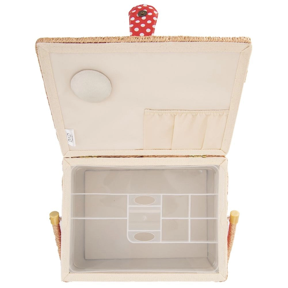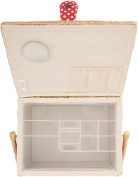 En el interior encontrarás un organizador de plástico extraíble con 4 compartimentos para hilos, agujas, enhebradores o botones. Al retirarlo, obtendrás un espacio amplio para utensilios de costura más grandes. La cara interior de la tapa incorpora un bolsillo elástico y un alfiletero, donde podrás clavar alfileres y agujas cómodamente. La cesta también es ideal como organizador de bisutería.