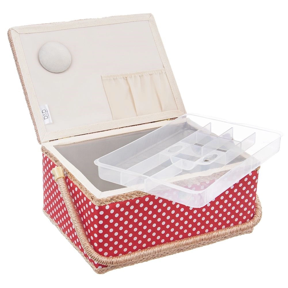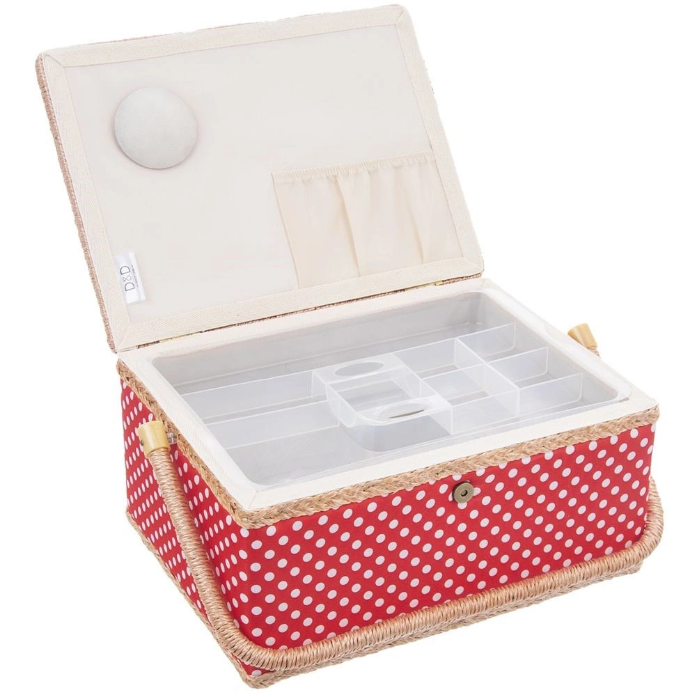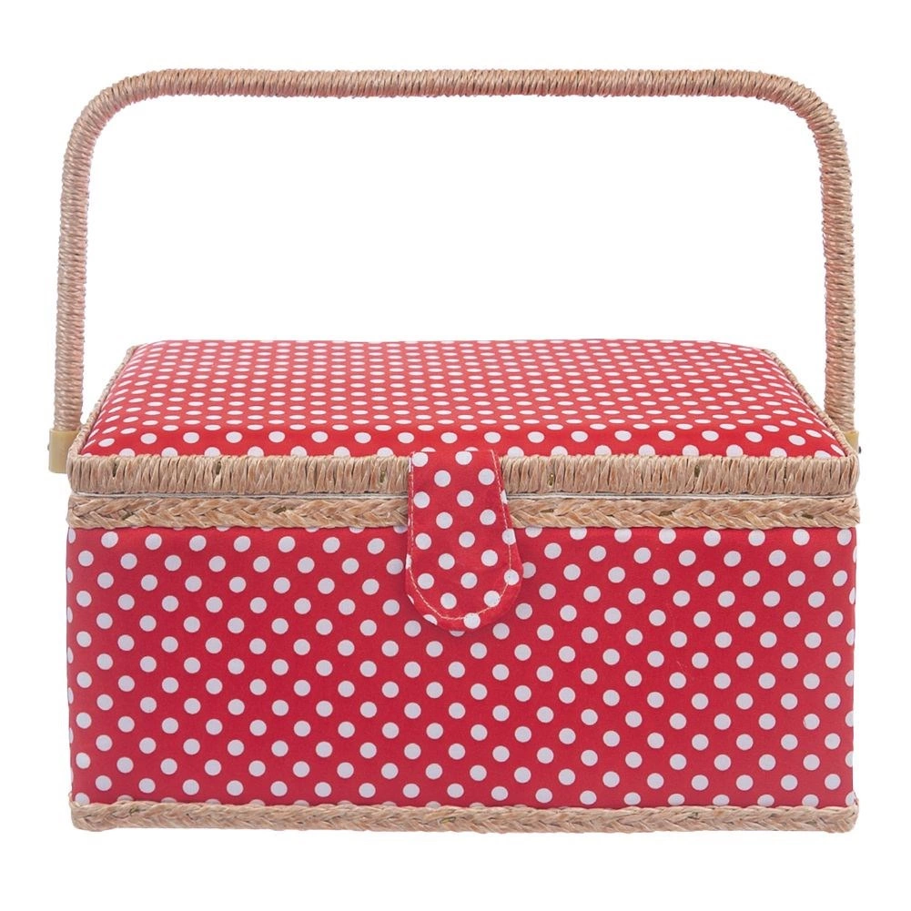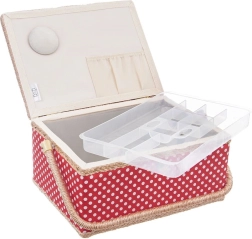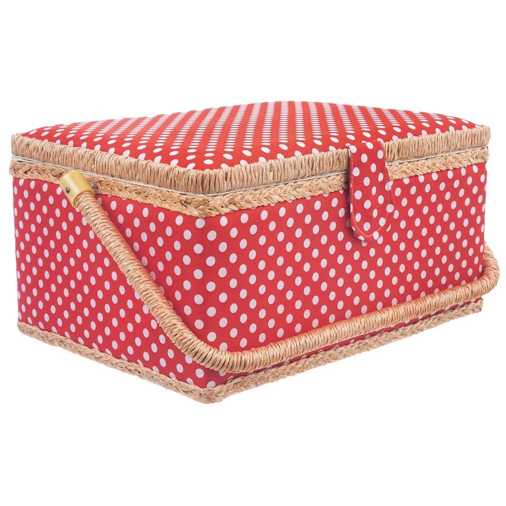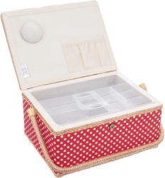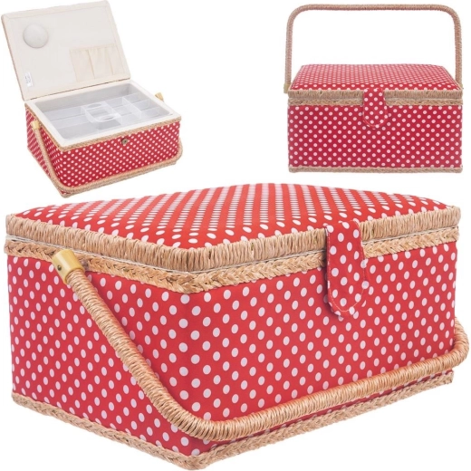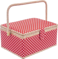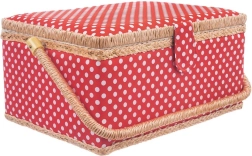 Esta cesta de costura combina un diseño atractivo con una organización bien pensada. El cuerpo de la cesta está forrado con tela roja de lunares blancos y equipado con un asa resistente para facilitar el transporte. Gracias al cierre magnético, la cesta se cierra con un solo movimiento y el contenido permanece en su lugar incluso al trasladarla.