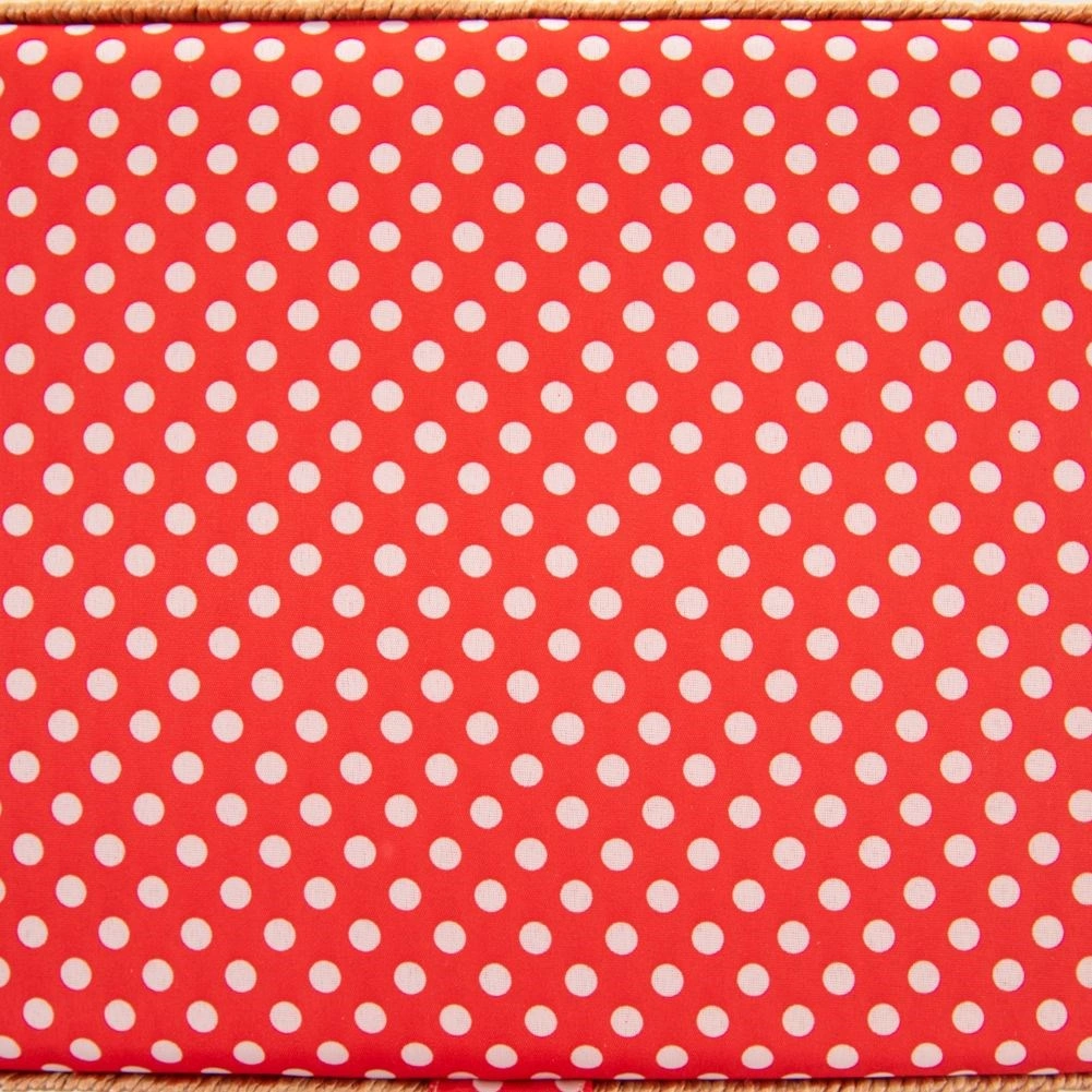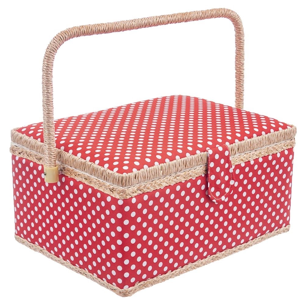 La tela roja con lunares blancos y el trenzado decorativo aportan estilo a la costura y la cesta encaja perfectamente en cualquier taller doméstico.